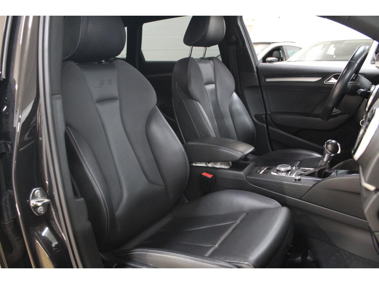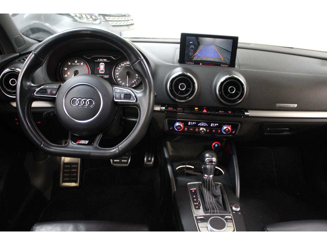 Audi Drive Select, permet différents réglagesChâssis Sport S surbaissé de 25 mm, avec suspension et amortisseurs plus fermesDétecteur de pluie et de luminositéDirection progressive contribuant à une augmentation de la dynamique de conduiteEssuie-glace arrière à déclenchement automatique au passage de la marche arrièreFixation pour sièges enfants ISOFIX et Top Tether pour les places arrière extérieuresInscriptions S3 sur la calandre, le capot de coffre, les baguettes des seuils de portes, les étriers de freins avant, le volant Sport, le pommeau de levier de vitesses et le compte-toursPédalier en acier inoxydable brosséQuattro: transmission intégrale permanente avec répartition asymétrique et dynamique de coupleRégulateur de vitesse avec maintien constant de la vitesse souhaitée à partir d'environ 30 km/hSeuils de portes avec inserts en aluminium et emblème S3Sièges conducteur et passager avant réglables en hauteurSorties d'échappement chromées, visibles et doubles, 2 sorties ovales chromées à gauche et à droiteXénon plus : réglage automatique du site des phares, lave-phares, feux de jour, feux arrière et feux d'éclairage de la plaque d'immatriculation arrière à LED