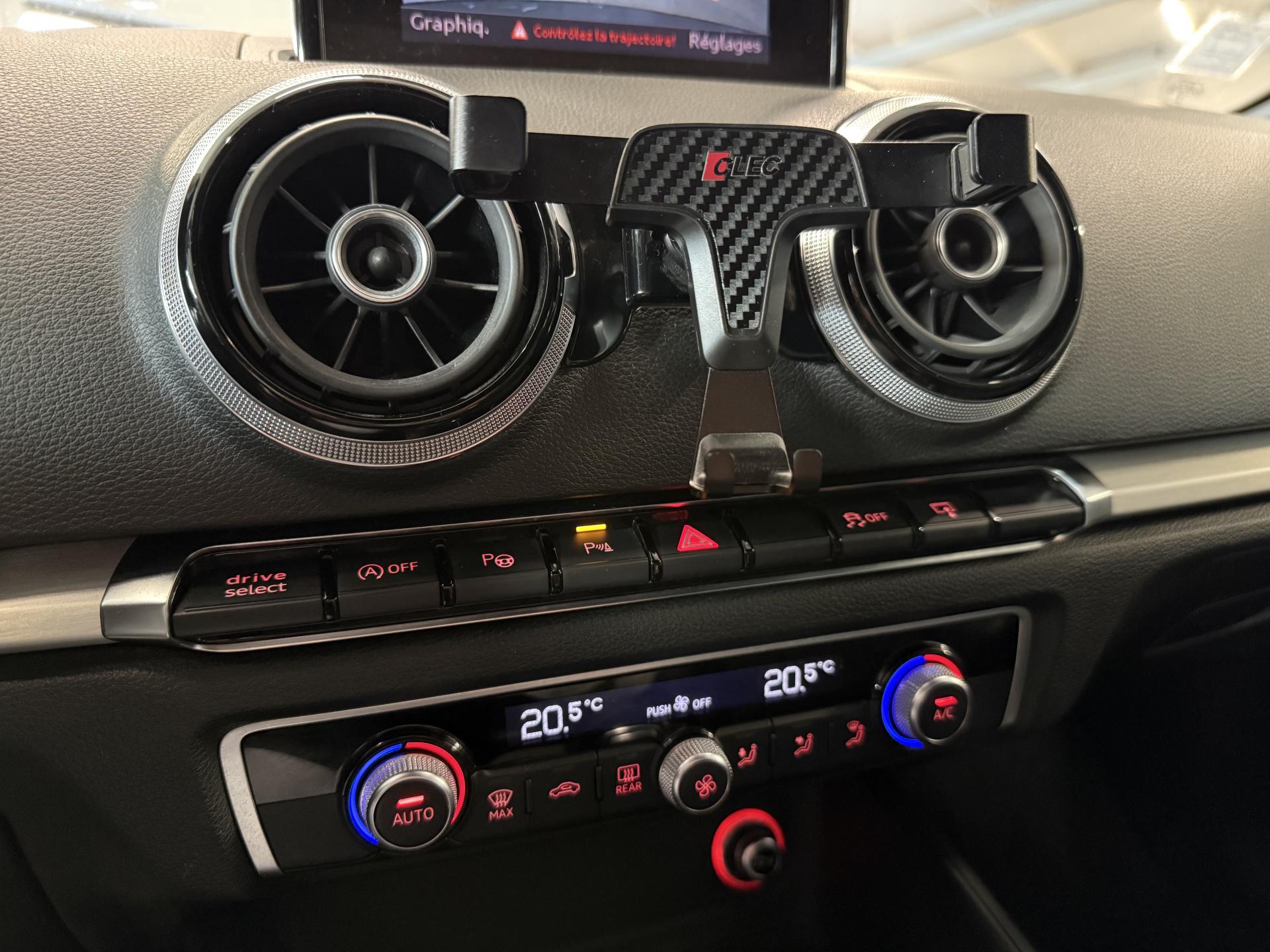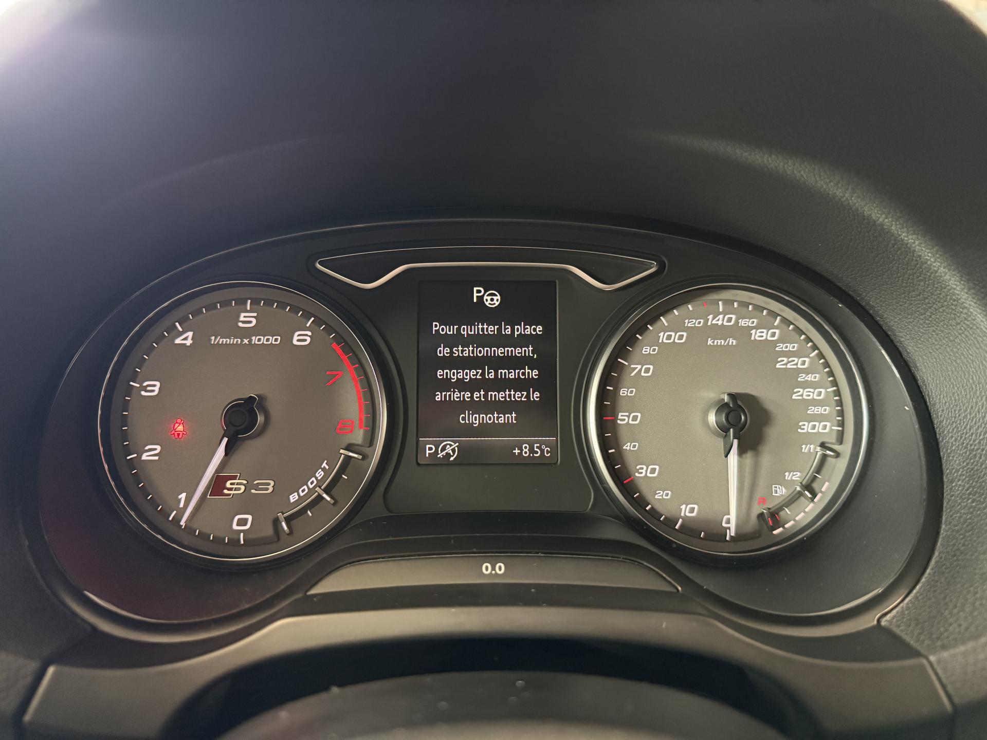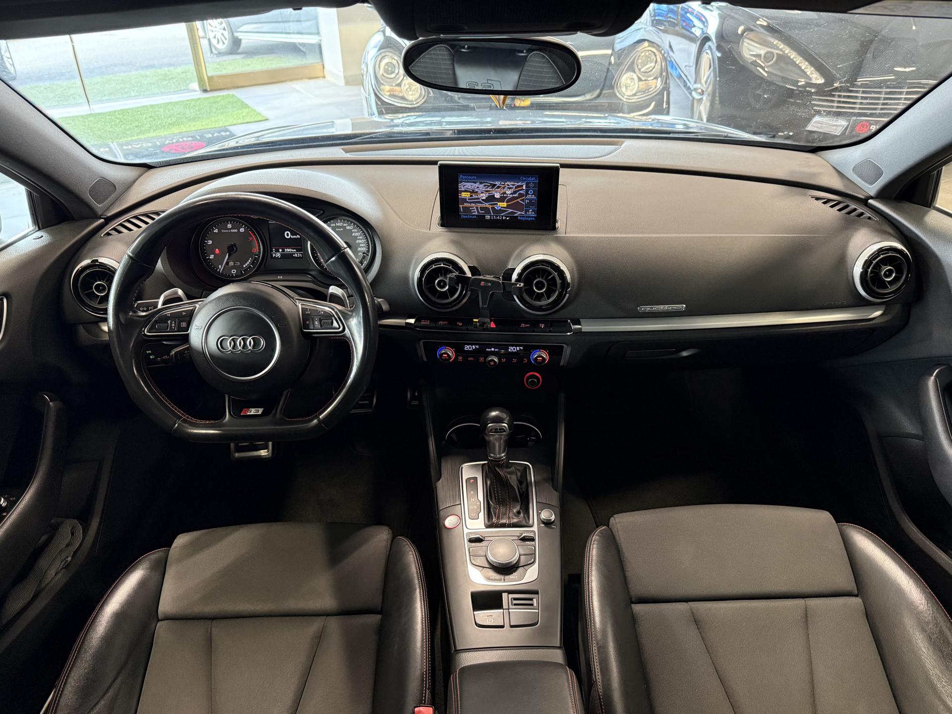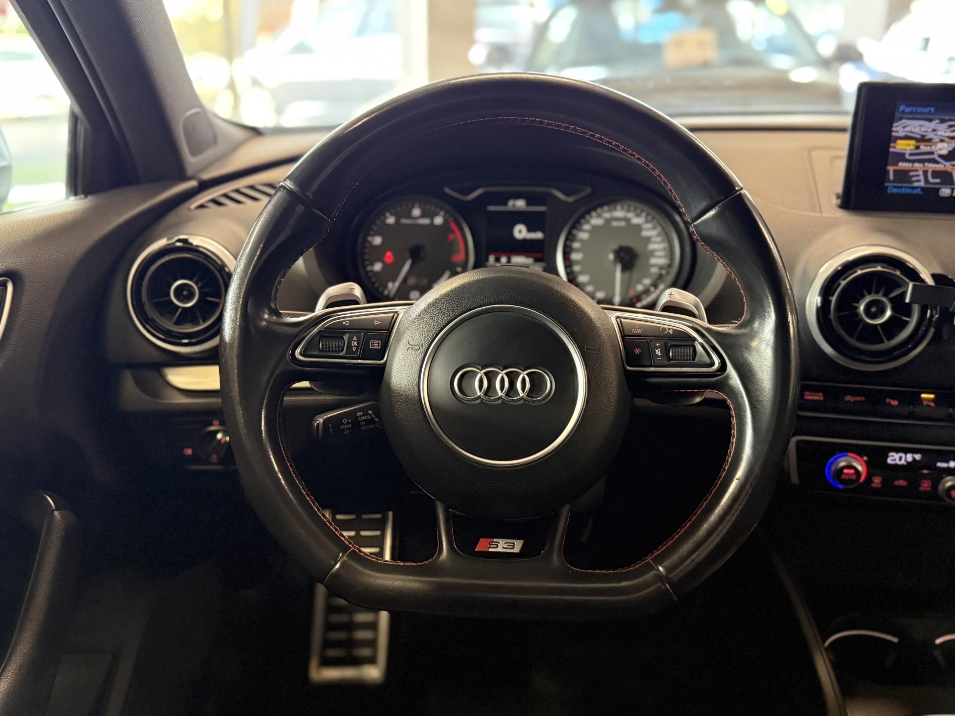 Accoudoir central avant coulissant en longueur, avec vide-poches relevable et inclinaison réglableAirbag genoux conducteurAirbags grand volume pour le conducteur et le passagerAirbags latéraux à l'avant intégrés au dossier des siègesAlarme antivol : avec protection anti-remorquage par capteur d'angle d'inclinaisonAllume-cigare et cendrier amovible, couvercle chromé avec anneaux Audi, allume-cigare sur la console centrale au lieu de la prise 12 volts de sérieAntipatinage électronique ASRApplications décoratives sur les contre-portes et tableau de bord "Aluminium brossé mat"Audi Drive Select, permet différents réglagesAudi parking system à l'arrière facilitant le stationnement dans les limites du système à l'aide d'un signal sonoreAudi Premium Tracking SystemAudi Sound System avec 10 haut-parleursBecquet de pavillon S3, laqué dans la couleur de la carrosserie, avec inserts aérodynamiques latéraux noir brillantBlocage électronique de différentiel (EDS)Boîte à gants grand volume côté passager avant, éclairéeCache-bagages amovibleCalandre Audi singleframe gris platine avec entretoises horizontales chromées, avec anneaux Audi chromés au centreCarrosserie galvanisée (entièrement galvanisée aux endroits sensibles à la corrosion)Ceintures de sécurité 3 points automatiques pour toutes les placesChâssis Sport S surbaissé de 25 mm, avec suspension et amortisseurs plus fermesCiel de pavillon en tissu noirClimatisation automatique Confort avec réglage asservi à la position du soleilContrôle de ceinture attachée pour toutes les placesContrôle de pression des pneus ( TPMS )Contrôle électronique de stabilisation (ESC) désactivable, avec amplificateur hydraulique de freinage d'urgenceDétecteur de pluie et allumage automatique des projecteursDirection progressive contribuant à une augmentation de la dynamique de conduiteDossier de banquette arrière rabattable en deux parties 40/60 ou complètementEcrous antivolEssuie-glace arrière avec déclenchement automatique en marche arrièreFeux arrière avec feux de recul blancs et feux de brouillard arrière, incluant troisième feu stop surélevé et éclairage de plaque à LEDFeux de freinage adaptatifsFeux de route assistés : gestion automatique du passage de feux de croisement à pleins phares et inversementFixation pour sièges enfants ISOFIX et Top Tether pour les places arrière extérieuresIdentification du modèle/technologie sur le capot de coffre ; sur demande sans identification du modèle à l'arrièreInscription quattro sur la calandre, le capot de coffre et le tableau de bord côté passagerInscriptions S3 sur la calandre, le capot de coffre, les baguettes des seuils de portes, les étriers de freins avant, le volant Sport, le pommeau de levier de vitesses et le compte-toursJantes en aluminium coulé style 5 branches doubles en étoile (style S) anthracite, partiellement polies avec pneus 225/40 R 18Lave-essuie-glace 2 vitesses, 4 intervalles de balayage réglablesLève-vitres à l'avant et à l'arrière, électriques, avec protection antipincement, ouverture/fermeture par le verrouillage centralisé, fonction ouverture/fermeture par impulsionLunette arrière dégivrante, avec minuterie; chauffage supplémentaire de l'extrémité inférieure de l'essuie-glace arrièreMMI GPS plus avec données de navigationOEilletons de fixation, 4 dans le coffre, pour maintenir les bagages et objets dans le coffre, points de fixation pour le filet mixte en optionOutillage de bord dans le coffre incluant un cricPack aluminium extérieurPack aluminium intérieurPack EclairagePack rangement et coffrePare-brise acoustique, améliore l'isolation phonique du pare-brise et réduit les bruits extérieursPare-chocs laqués dans la couleur de carrosserie avec prises d'air latérales accentuées, extension de bas de caisse ainsi que diffuseur S à l'arrière au design résolument sportifPare-soleil rabattables et pivotants, côtés conducteur et passager avant, avec miroir de courtoisie occultablePatères à vêtements sur les montants de pavillon centraux, à gauche et à droite, simplesPédalier en acier inoxydable brosséPoignées de maintien. 4 poignées avec mécanisme amortisseur, rabattables, encastrées dans le pavillonPréparation pour téléphone portable (Bluetooth), commande sur volant multifonction, mains libres et audiostreamingPrise de courant 12 volts sur la console centrale à l'avantProtection antidémarrage électronique, intégrée à la gestion du moteur, activation automatique par la clé du véhiculeProtection latérale anticollision avec barres extrêmement rigides dans les portières et une structure latérale de carrosserie renforcéeQuattro: transmission intégrale permanente avec répartition asymétrique et dynamique de coupleRangements dans les contre-portes à l'avant avec casier de rangement pour boissons, rangements dans les contre-portes arrièreRecommandation de repos qui analyse le comportement routier au moyen de différents capteursRégulateur de vitesse avec maintien constant de la vitesse souhaitée à partir d'environ 30 km/hRétroviseur intérieur électrochromeRétroviseurs extérieurs style aluminium avec rappels de clignotant à diodes, asphérique côté conducteur, convexe côté passager avant, dégivrants et escamotables électriquementRoue de secours temporaire de type galetteSellerie mixte en Alcantara et cuir MilanoSeuils de portes avec inserts en aluminium et emblème S3Sièges conducteur et passager avant réglables en hauteurSièges Sport à l'avant avec estampillage SSignal sonore pour oubli d'extinction des feuxSorties d'échappement chromées, visibles et doubles, 2 sorties ovales chromées à gauche et à droiteSupport pour téléphone portable et clé avec compatiment séparé pour le rangement du téléphone portable et la clé du véhicule. Rangement intégré avec encadrement chromé sur la console centraleSystème d'airbags de têteSystème d'information du conduc