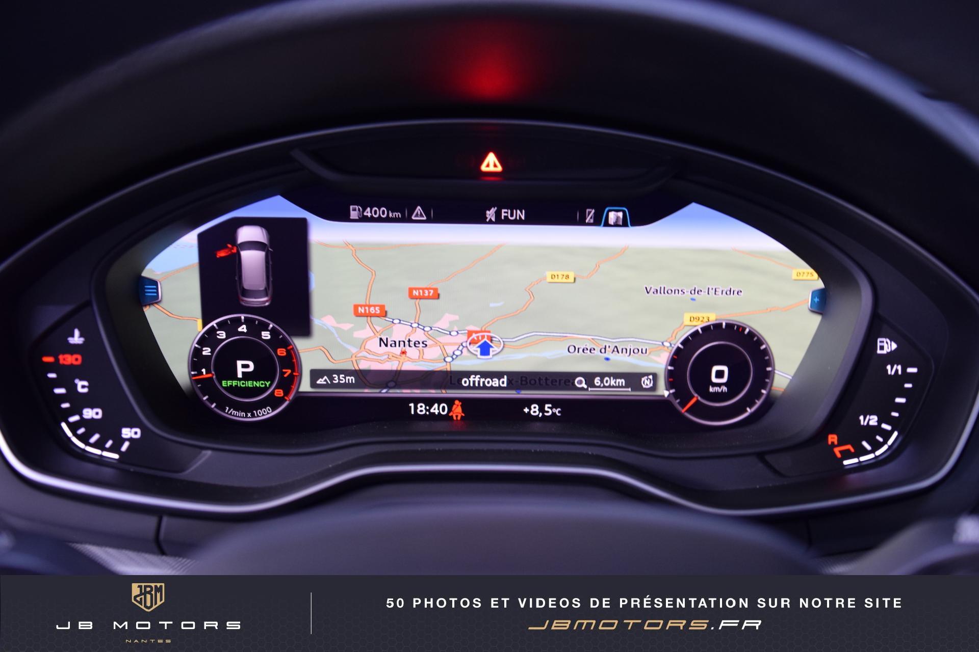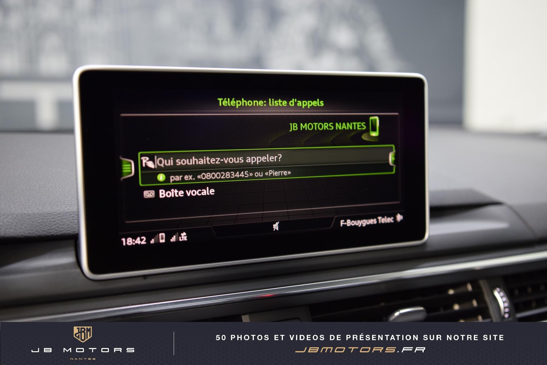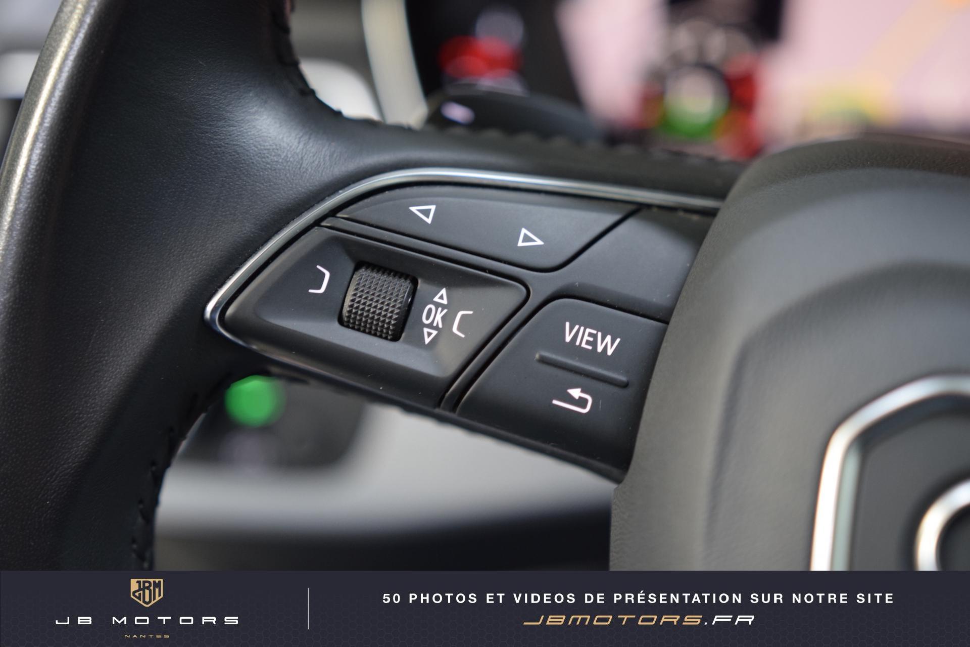 Volant 3 branches multifonction plus en cuir avec palettes de... 3 profils de couleur prédéfinis et un profil de... Accoudoir central AR Airbags latéraux AR Audi Connect avec une carte SIM de données intégrée... Audi Hold Assist (Assistant de démarrage en pente) Audi Parking System Plus: Signal sonore et visuel d'aide... Audi phone box Audi Pre Sense Basic Audi Sound System Audi Virtual Cockpit : Système d'information du conducteur... Boîte à gants verrouillable Clignotants AV/AR dynamiques Coffre : système de glissières avec kit de fixation... Coming Home / Leaving Home Commutation des phares Eclairage de carrefours Eclairage tout-temps Feux AR à LED Feux de virage dynamiques Filet de coffre Filet de rangement au dos des sièges AV Jantes en aluminium coulé style 5 branches parallèles,... Lave phares haute pression Navigation MMI Plus avec MMI Touch: Système de navigation Pack Eclairage Peinture métallisée Réglage automatique dynamique du site des phares Rétroviseurs extérieurs réglables et escamotables... Sangles de serrage à gauche et à droite dans le... Sièges AV chauffants Vide-poches côté conducteur