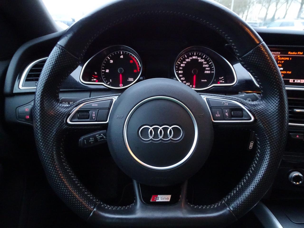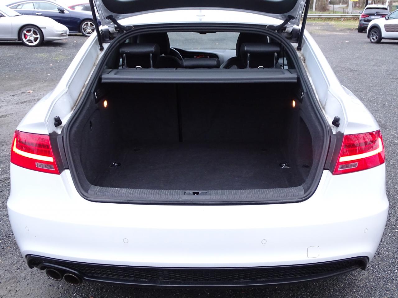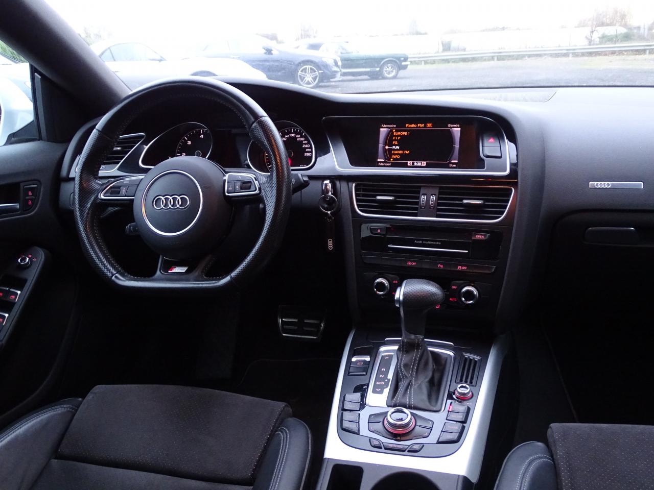 Accoudoir central avant avec vide-poches et 2 prises 12 V dans la console centraleÉtui à lunettes, dans le module d'éclairage intérieur avant, au-dessus du rétroviseur intérieurAirbags grand volume pour conducteur et passager avant avec détecteur de la position d'assise ; airbag adaptatif pour le conducteur et passager avantAirbags latérauxAllume-cigare intégré dans le cendrier avantAntipatinage ASR pour une motricité optimale, empêche le patinage des roues motricesApplications décoratives en aluminium brossé matAppuie-têtes réglables à l'avant et à l'arrièreAudi Music InterfaceAvertisseur deux tons avec commande au centre du volantBanquette arrière 3 placesBlocage électronique de différentiel EDS, aide au démarrage intervenant jusqu'à une vitesse d'environ 100 km/h, freinant automatiquement les roues motrices sur route glissante et inégalement adhérenteCalandre Singleframe avec lamelles horizontales noires brillantesCapot de coffre à déverrouillage par la télécommande ou par actionnement de la touche douce sur le capot du coffreCarrosserie galvaniséeCeintures de sécurité, automatiques à 3 points pour les 5 places, contrôle de port de ceinture, couleur assortie à celle de l'habitacleCendrier dans la console centrale à l'avant et à l'arrièreChâssis DynamiqueChâssis Sport avec amortissement plus ferme et suspensions renforcéesCiel de pavillon en tissu noirCiel de pavillon en tissu, selon la couleur choisie, argent lunaire, noir ou beige pashminaClimatisation automatique Confort Plus 3 zones à fonctionnalités étendues et affichage numériqueColonne de direction de sécuritéContact d'allumage électronique ; clé de contact pouvant mémoriser différentes données d'entretienContrôle électronique de stabilisation ESC, relie ABS, ASR et EDS à ses propres capteursContrôle de pression des pneus, vérifie durant la marche la pression de chacune des roues en serviceCric dans le coffreDésactivation de l'airbag passager (désactive aussi l'airbag latéral passager)Détecteur de pluie et allumage automatique des projecteursDirection asservie à la vitesse servotronicDossier des sièges arrière rabattable séparément 2/3 - 1/3, avec déverrouillage à distance des dossiers depuis le coffreEclairage intérieur à extinction temporisée et contacteurs sur toutes les portières ; éclairage coffre, conducteur passager avant et arrière, deux spots de lecture à l'avant, éclairage intérieur de l'arrière, miroir de cEcrous antivolEntourages de vitre en aluminium, revêtement noir brillant sur les montants de pavillon centraux et les triangles des portières arrièreFonction Start/StopFrein de stationnement electromécaniqueGPS PlusIndicateur d'usure des disques à l'avantIndicateur de température extérieure dans le système d'information du conducteurInstrumentation à éclairage réglable, tachymètre électronique avec compteur kilométrique totalisateur et journalier, compte-tours, horloge, indicateur de température du liquide de refroidissement et jauge de carburantJantes Audi Sport en aluminium coulé style 5 branches « Rotor », finition titane, polies, 9 J x 19”, avec pneus 255/35 R19Lève-vitres électriques à l'avant et à l'arrière avec protection antipincement et fonction ouverture/fermeture Confort par impulsionLave-glace, deux vitesses, réglage d'intermittence sur 4 niveaux, commande de balayage coup par coup, lavage-balayage automatiqueLimiteurs d'effort des ceintures de sécurité avantLunette arrière dégivrante avec minuterieOrdinateur de bord couleur et système de contrôle AutocheckOutillage de bord dans le coffrePack EclairagePack Extérieur S lineParking System : système acoustique d'aide au stationnement arrièrePhares antibrouillard intégrés dans le pare-chocsPoignées de maintien, amorties, rabattables dans les deux sens, dans le ciel de pavillonPoignées de portières extérieures laquées dans la couleur de carrosserie, poignées cintrées agréables à utiliserPommeau de levier de vitesses en cuir perforé, surpiqûres de soufflet de levier de vitesses argentPré-équipement attelagePréparation ISOFIX pour sièges latéraux arrière et siège passager avantPréparation téléphone 2 W bi-bande (D et E), sans support pour adaptateur ni antenne de toit, commande sur volant multifonction, mains libres, interface BluetoothPrétensionneurs des ceintures de sécurité avantProtection antidémarrage électronique, intégrée à la gestion du moteur, activation automatique par la clé du véhiculeQuatre oeilletons de fixation, pour maintenir les bagages et objets dans le coffre, points de suspension pour le filet mixteRégulateur de vitesse électronique actif dès 30 km/h. Inclut fonction de freinage. Affichage de la vitesse paramétrée sur l'écran de l'ordinateur de bordRéservoir avec protection contre les erreurs de ravitaillementRétroviseur intérieur jour/nuit automatique incluant une bande grise en haut du pare-briseRétroviseurs extérieurs avec clignotant latéral intégré à diodes, réglable électriquement, boîtiers dans la couleur de la carrosserie, miroir asphériqueRétroviseurs extérieurs et buses de lave-glace chauffantsRangements dans les contre-portes à l'avant avec casier de rangement pour boissons, rangements à l'arrière sur les côtés du siège et dans les garnitures latérales arrièreSellerie mixte cuir/Alcantara perforé Sprint avec logo S line sur le dossier des sièges avantSièges avant réglables manuellement en hauteur et en profondeurSièges avant Sport incluant réglage de la longueur d'assise et appuis lombaires électriques sur 4 plans.Sideguard, système d'airbags de tête grand formatSortie d'échappement visible double, une double sortie à gaucheStyle aluminium, dans l'habitacle sur les commutateurs d'éclairage, la commande de la climatisation, la commande MMI, les diffuseurs d'air et autour du soufflet et du levier de vitesseSystème audiophonique Audi : amplificateur