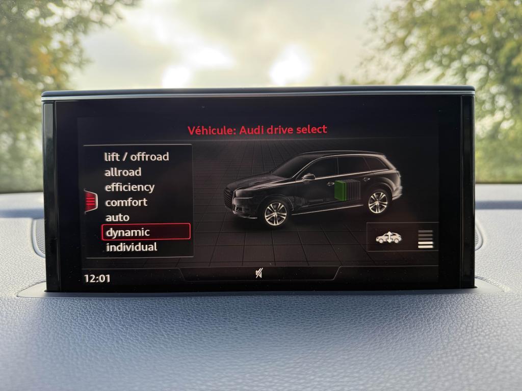 Accoudoir central avant ConfortAdaptive Air Suspension : système de suspension pneumatique à régulation électroniqueAssistant de feux de routeAudi connect "Sécurité et Service"Audi connect avec une carte SIM de données intégréeAudi drive select : réglage des caractéristiques individuelles du véhicule selon les modes disponibles : auto, confort, dynamic, efficiency, offroad et individualAudi Hold AssistAudi Music InterfaceAudi Phone BoxAudi pre sense cityAudi pre-sense basicAudi smartphone interfaceAudi Tracking SystemAudi virtual cockpitBose sound system avec son 3D : 19 haut-parleurs 558 wattsCâble de chargement 11kW pour les bornes de recharge publiquesClimatisation 3 zones (2 à l'avant et 1 à l'arrière) avec écran TFTDétecteur de pluie et allumage automatique des projecteursDossier de banquette arrière rabattable asymétriquement selon un rapport 35 /30 /35Eclairage d'ambiance à LEDEcrous antivol pour les rouesFixation ISOFIX sur siège passager avantFixations ISOFIX Top Tether pour les places latérales arrièreHayon de coffre à ouverture et fermeture électriquesInterface BluetoothKeyless entry : système de verrouillage et de déverrouillage du véhicule sans utilisation de la cléNavigation MMI plus avec MMI touchPack Assistance CityPack Assistance StationnementPack Audi Side AssistPack brillancePack cuirPhares avant Full LEDPrise de charge électrique sur l'aile arrière gauche du véhiculeQuattro: transmission intégrale permanente avec répartition asymétrique et dynamique de coupleRécupération de l'énergie au freinageRéglage électrique de la colonne de direction et du volantRétroviseurs extérieurs dégivrants et rabattables électriquementSellerie cuir CricketSièges avant chauffantsSièges avant réglables électriquement avec fonction mémoire pour les sièges conducteur et passager. Comprend support lombaire à réglage électrique 4 voiesSignature optique à LED dans le bouclier avant spécifiqueSystème de recharge e-tron : ce système comprend, en plus du câble du véhicule et de l'unité de commande, 2 câbles de branchement interchangeablesSystème Start/ Stop avec récupération d'énergie de freinageToit panoramique en verre électriqueTouche EV permet de choisir parmi les différents modes : EV (ou tout électrique)Volant multifonction 4 branches en cuir avec palettes de changement de vitesse