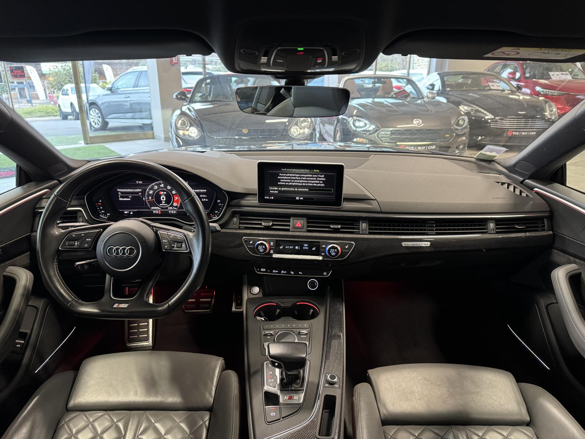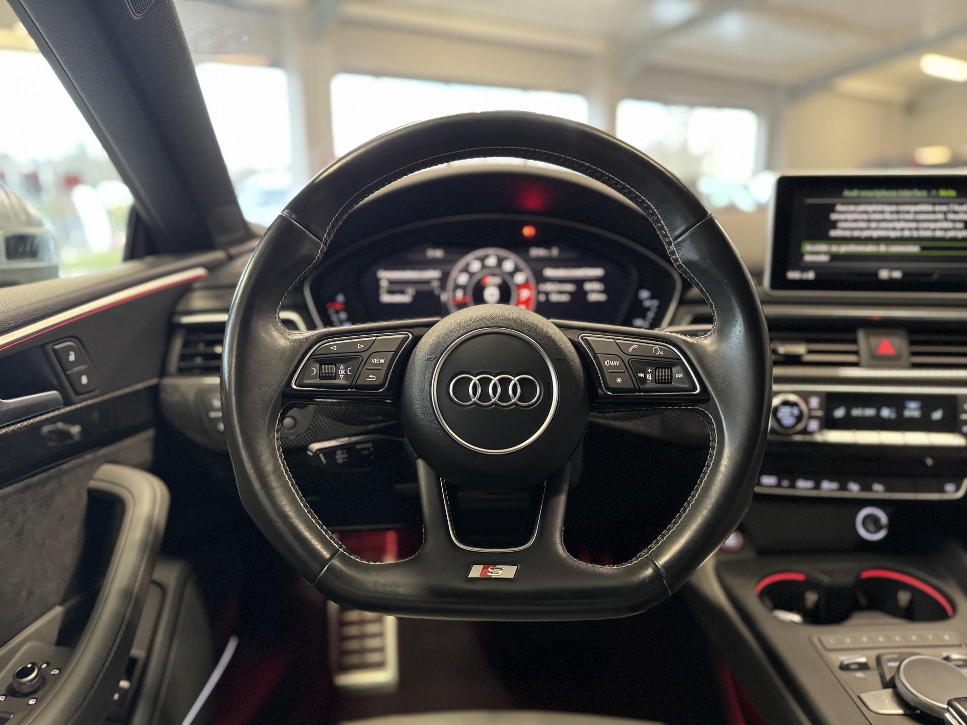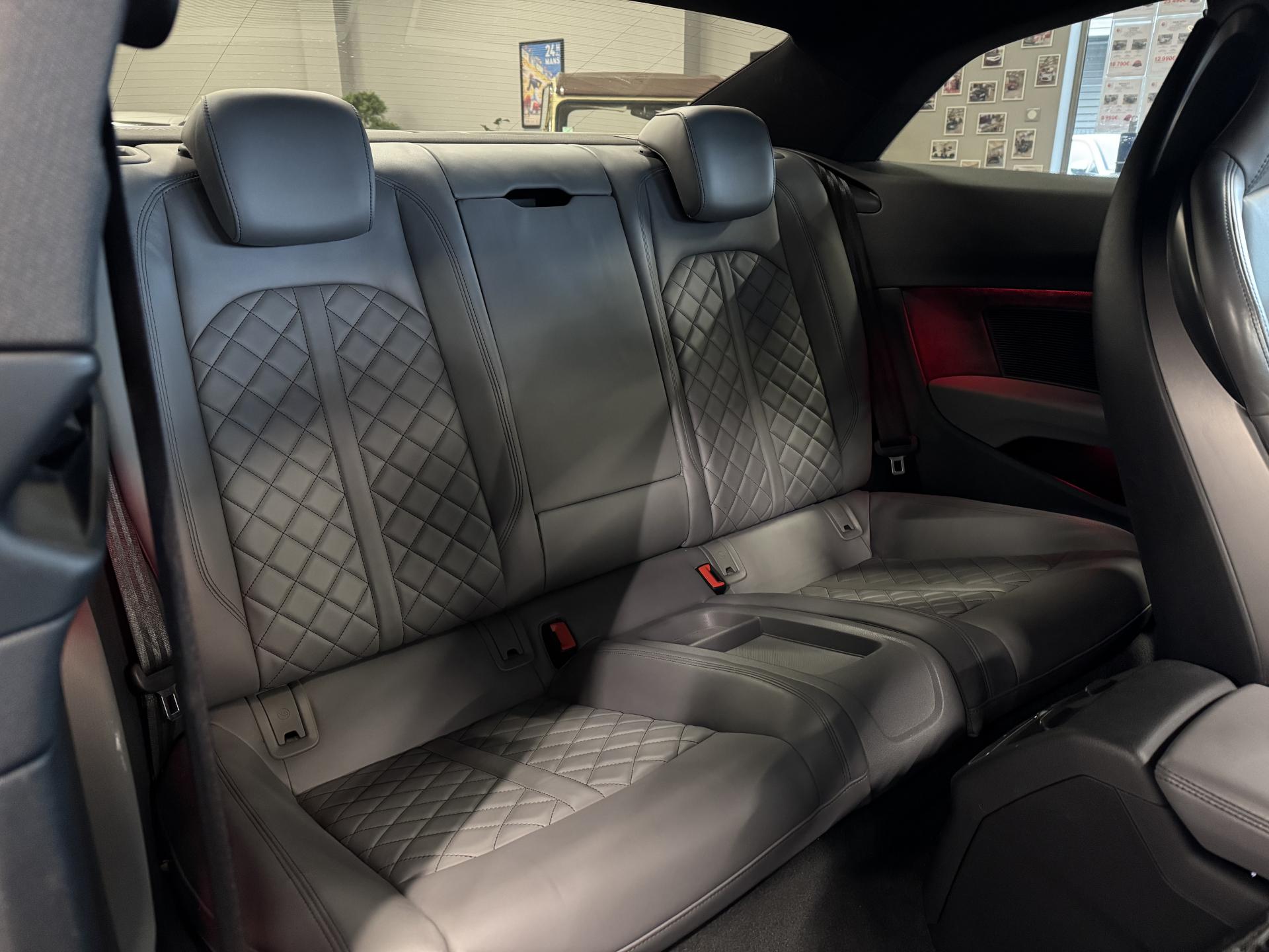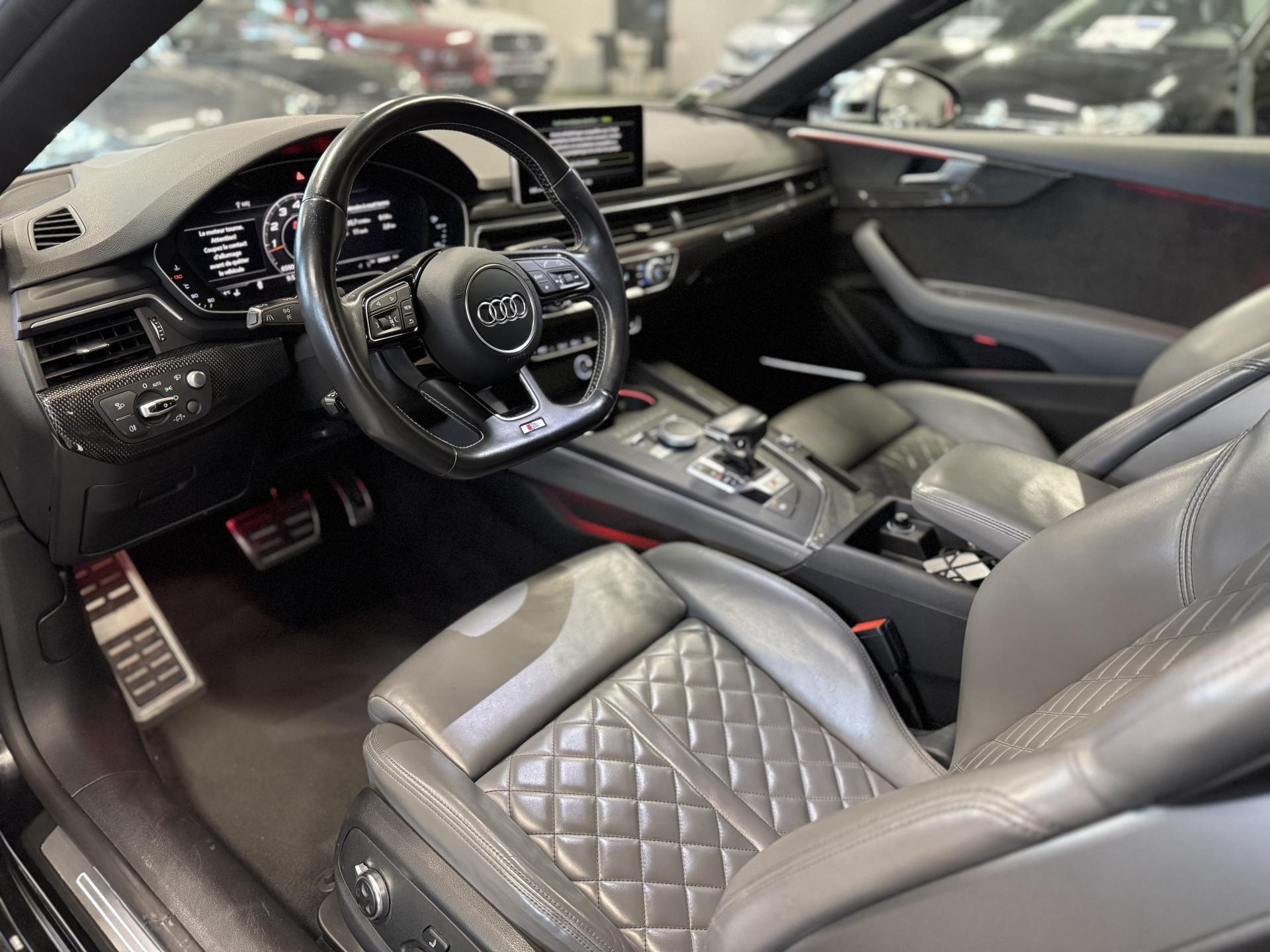 Accès ConfortAccoudoir central confort à l'avant avec inclinaison réglable et coulissant en longueurAffichage du contrôle de la pression des pneumatiquesAirbags grand volume pour le conducteur et le passagerAirbags latéraux à l'avant et système d'airbags de têteAllume cigare et cendrierAntipatinage ASR pour une motricité optimale, empêche le patinage des roues motricesApplications décoratives en aluminium brossé matAppui lombaire à 4 axes avec réglage électrique, pour les sièges conducteur et passager avant, réglage horizontal et verticalAudi connectAudi connect "Sécurité et Service"Audi Drive SelectAudi Hold AssistAudi phone box avec chargeur sans filAudi smartphone interfaceAudi sound system : 10 haut-parleurs incluant un haut-parleur central et un subwoofer ; amplificateur à 6 canaux avec une puissance totale de 180 wattsAudi Tracking System : système d'immobilisation et de localisation du véhicule par satelliteAudi virtual cockpitBlocage électronique de différentiel (EDS)Capot de coffre à ouverture automatique, en déverrouillant le coffre avec la télécommande, la touche sur la portière ou en actionnant la touche douce de déverrouillage au niveau du coffre, le capot de coffre bascule automatiquementCarrosserie galvaniséeCeintures de sécurité automatiques à trois points pour les quatre places, avec contrôle du port de ceinture à l'avant, couleur assortie à celle de l'habitacleChâssis sport SCiel de pavillon en tissu noirClé confortClimatisation automatique Confort Plus 3 zones à fonctionnalités étendues et affichage numériqueColonne de direction de sécuritéCoques de rétroviseurs extérieurs en aluminiumDésactivation de l'airbag du passager avantDétecteur de pluie et allumage automatique des projecteursDirection assistée électromécaniqueDispositif anti-erreur de carburantDossier de banquette arrière 2 places, rabattable à distance et en trois parties 40 : 20 : 40 ou complètementEclairage intérieurEcrous antivolEléments extérieurs spécifiques S : calandre singleframe avec lamelles aluminium avec logo S5, grilles d'entrée d'air latérales en chrome foncé avec applications aluminium, étriers de frein noir avec logo S5, diffuseur arrière noir avESC (contrôle électronique de stabilisation)Fixation pour sièges enfants ISOFIX et Top Tether pour les places arrière extérieuresFixation pour sièges enfants ISOFIX sur le siège passager AV avec commande de désactivation d'airbag passager AVFrein de stationnement electromécaniqueInterface BluetoothJantes en aluminium coulé Audi Sport style 5 branches doubles, finition titane mat, polies brillant, 8,5 J x 19"Navigation MMI plus avec MMI touchOutillage de bord et cricPack Assistance CityPack brillance : entourages de vitres en aluminiumPare-chocs spécifiques S style dynamique et sportifPare-soleilPhares à LED avec clignotants arrière à LED dynamiquesPréparation pour crochet d'attelageQuattro : transmission intégrale permanenteRecommandation de repos qui analyse le comportement routier au moyen de différents capteursRégulateur et limiteur de vitesseRétroviseur intérieur électrochrome sans contourRétroviseurs extérieurs avec clignotants à LED intégrésRétroviseurs extérieurs réglables et escamotables électriquement, jour/nuit automatique, dégivrants des deux côtés et buses de lave-glaces dégivrantesRoue de secours à encombrement réduitSécurité enfantsSièges avant chauffantsSièges avant réglables électriquement avec fonction mémoires pour le siège conducteurSièges Sport à l'avantSorties d'échappement chromées, visibles et doubles, une double sortie à gauche et une sortie à droiteSystème Start/Stop réduit la consommation de carburant ainsi que les émissions de CO2Tapis complémentaires à l'avant et à l'arrièreTiptronic : boîte automatique 8 rapports avec programme de commande dynamique (DSP)Triangle de présignalisation et trousse de secoursVide-pochesVitres athermiquesVolant 3 branches multifonction plus en cuir avec méplat avec logo S5
