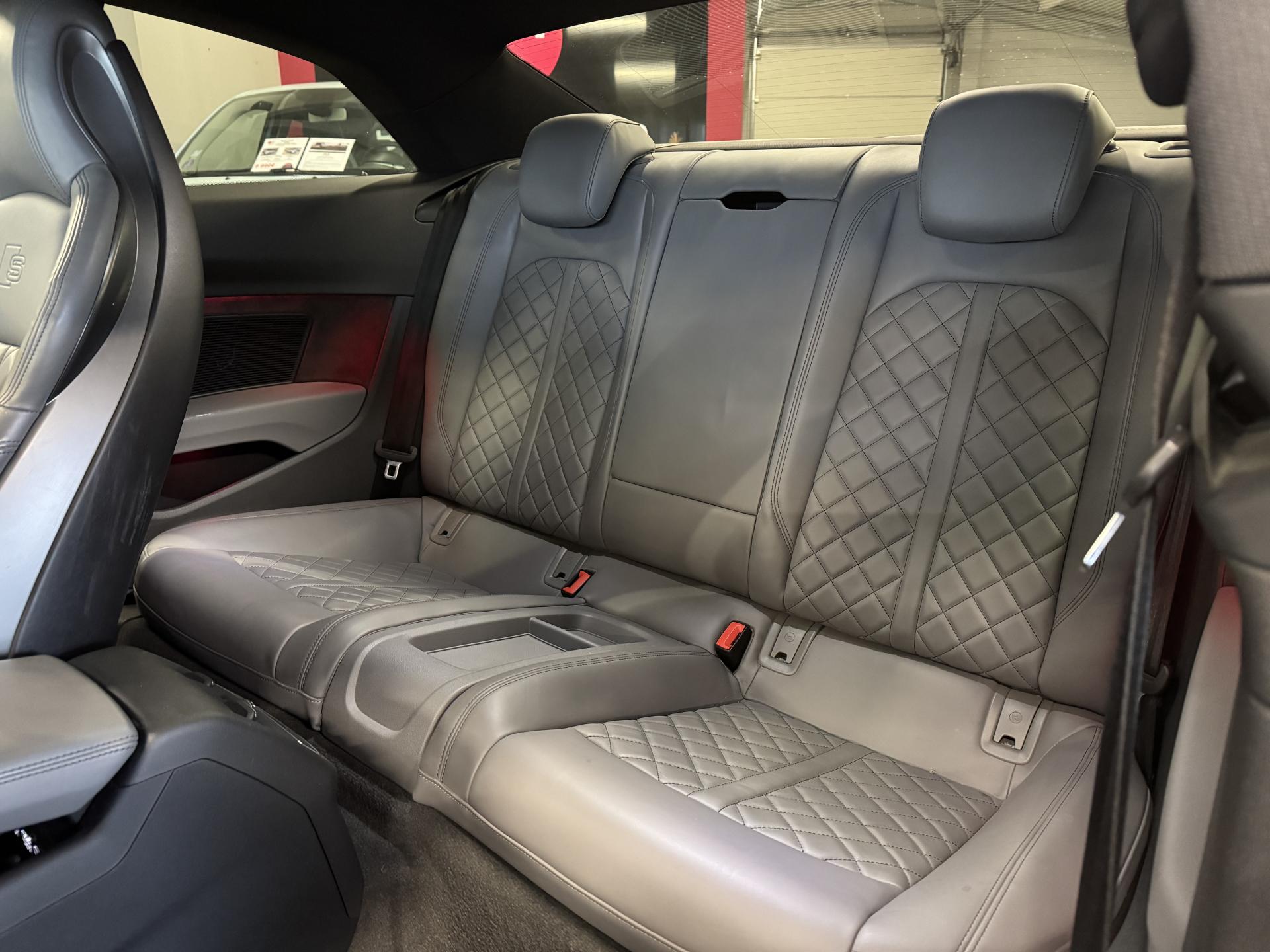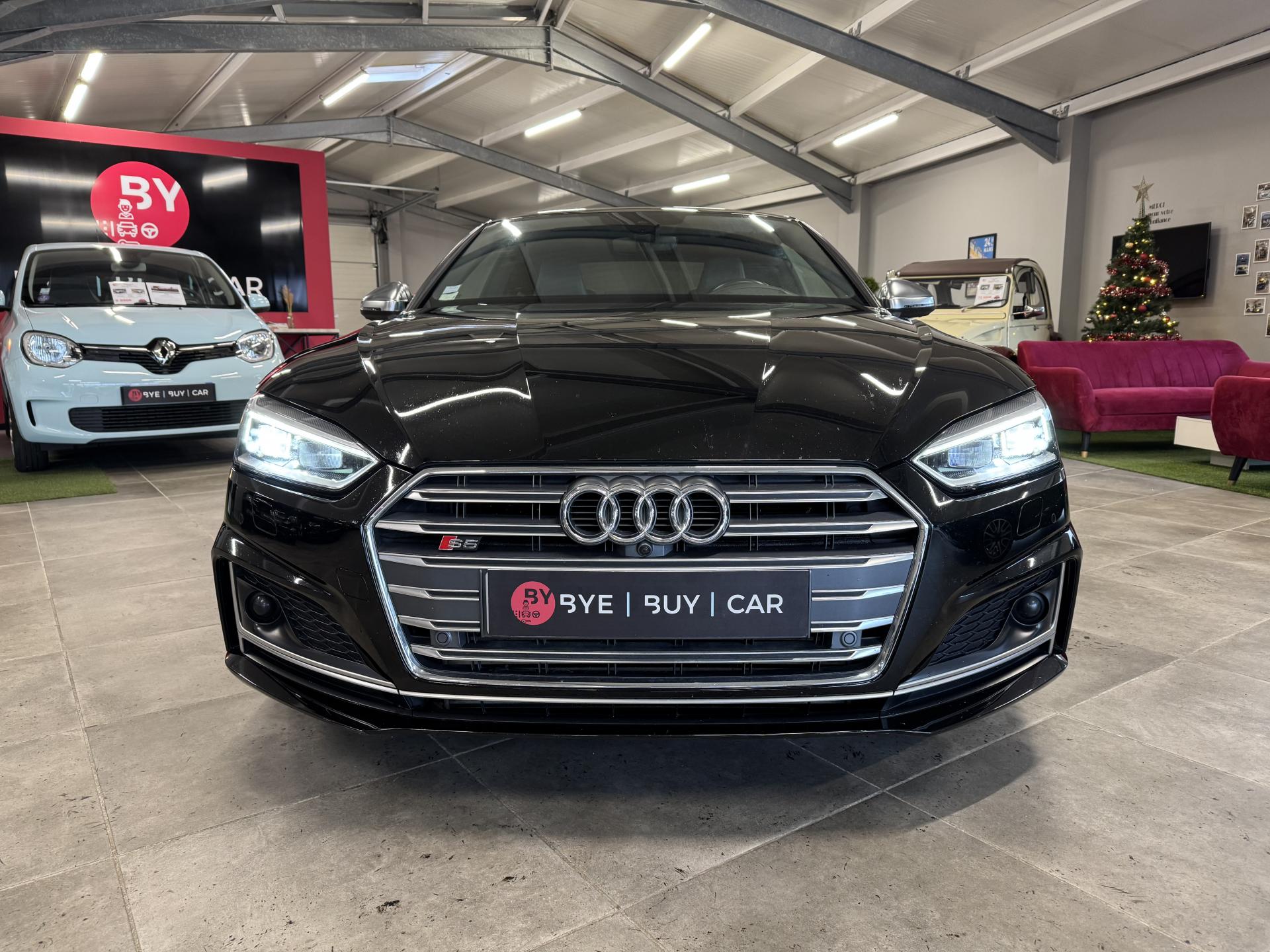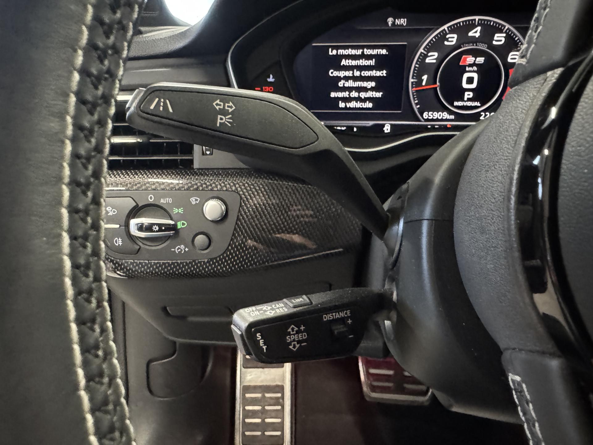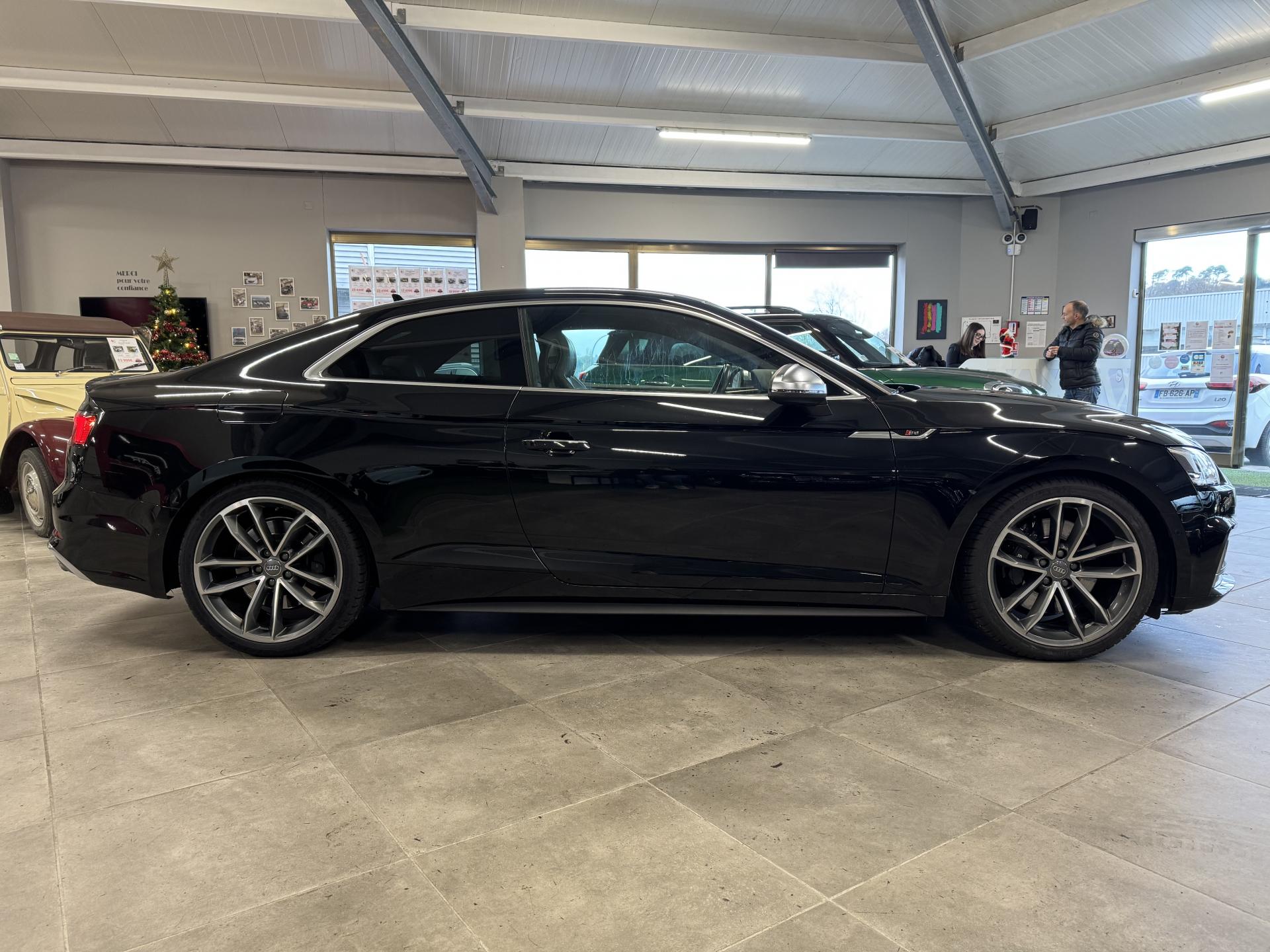 Accès ConfortAccoudoir central confort à l'avant avec inclinaison réglable et coulissant en longueurAffichage du contrôle de la pression des pneumatiquesAirbags grand volume pour le conducteur et le passagerAirbags latéraux à l'avant et système d'airbags de têteAllume cigare et cendrierAntipatinage ASR pour une motricité optimale, empêche le patinage des roues motricesApplications décoratives en aluminium brossé matAppui lombaire à 4 axes avec réglage électrique, pour les sièges conducteur et passager avant, réglage horizontal et verticalAudi connectAudi connect "Sécurité et Service"Audi Drive SelectAudi Hold AssistAudi phone box avec chargeur sans filAudi smartphone interfaceAudi sound system : 10 haut-parleurs incluant un haut-parleur central et un subwoofer ; amplificateur à 6 canaux avec une puissance totale de 180 wattsAudi Tracking System : système d'immobilisation et de localisation du véhicule par satelliteAudi virtual cockpitBlocage électronique de différentiel (EDS)Capot de coffre à ouverture automatique, en déverrouillant le coffre avec la télécommande, la touche sur la portière ou en actionnant la touche douce de déverrouillage au niveau du coffre, le capot de coffre bascule automatiquementCarrosserie galvaniséeCeintures de sécurité automatiques à trois points pour les quatre places, avec contrôle du port de ceinture à l'avant, couleur assortie à celle de l'habitacleChâssis sport SCiel de pavillon en tissu noirClé confortClimatisation automatique Confort Plus 3 zones à fonctionnalités étendues et affichage numériqueColonne de direction de sécuritéCoques de rétroviseurs extérieurs en aluminiumDésactivation de l'airbag du passager avantDétecteur de pluie et allumage automatique des projecteursDirection assistée électromécaniqueDispositif anti-erreur de carburantDossier de banquette arrière 2 places, rabattable à distance et en trois parties 40 : 20 : 40 ou complètementEclairage intérieurEcrous antivolEléments extérieurs spécifiques S : calandre singleframe avec lamelles aluminium avec logo S5, grilles d'entrée d'air latérales en chrome foncé avec applications aluminium, étriers de frein noir avec logo S5, diffuseur arrière noir avESC (contrôle électronique de stabilisation)Fixation pour sièges enfants ISOFIX et Top Tether pour les places arrière extérieuresFixation pour sièges enfants ISOFIX sur le siège passager AV avec commande de désactivation d'airbag passager AVFrein de stationnement electromécaniqueInterface BluetoothJantes en aluminium coulé Audi Sport style 5 branches doubles, finition titane mat, polies brillant, 8,5 J x 19"Navigation MMI plus avec MMI touchOutillage de bord et cricPack Assistance CityPack brillance : entourages de vitres en aluminiumPare-chocs spécifiques S style dynamique et sportifPare-soleilPhares à LED avec clignotants arrière à LED dynamiquesPréparation pour crochet d'attelageQuattro : transmission intégrale permanenteRecommandation de repos qui analyse le comportement routier au moyen de différents capteursRégulateur et limiteur de vitesseRétroviseur intérieur électrochrome sans contourRétroviseurs extérieurs avec clignotants à LED intégrésRétroviseurs extérieurs réglables et escamotables électriquement, jour/nuit automatique, dégivrants des deux côtés et buses de lave-glaces dégivrantesRoue de secours à encombrement réduitSécurité enfantsSièges avant chauffantsSièges avant réglables électriquement avec fonction mémoires pour le siège conducteurSièges Sport à l'avantSorties d'échappement chromées, visibles et doubles, une double sortie à gauche et une sortie à droiteSystème Start/Stop réduit la consommation de carburant ainsi que les émissions de CO2Tapis complémentaires à l'avant et à l'arrièreTiptronic : boîte automatique 8 rapports avec programme de commande dynamique (DSP)Triangle de présignalisation et trousse de secoursVide-pochesVitres athermiquesVolant 3 branches multifonction plus en cuir avec méplat avec logo S5