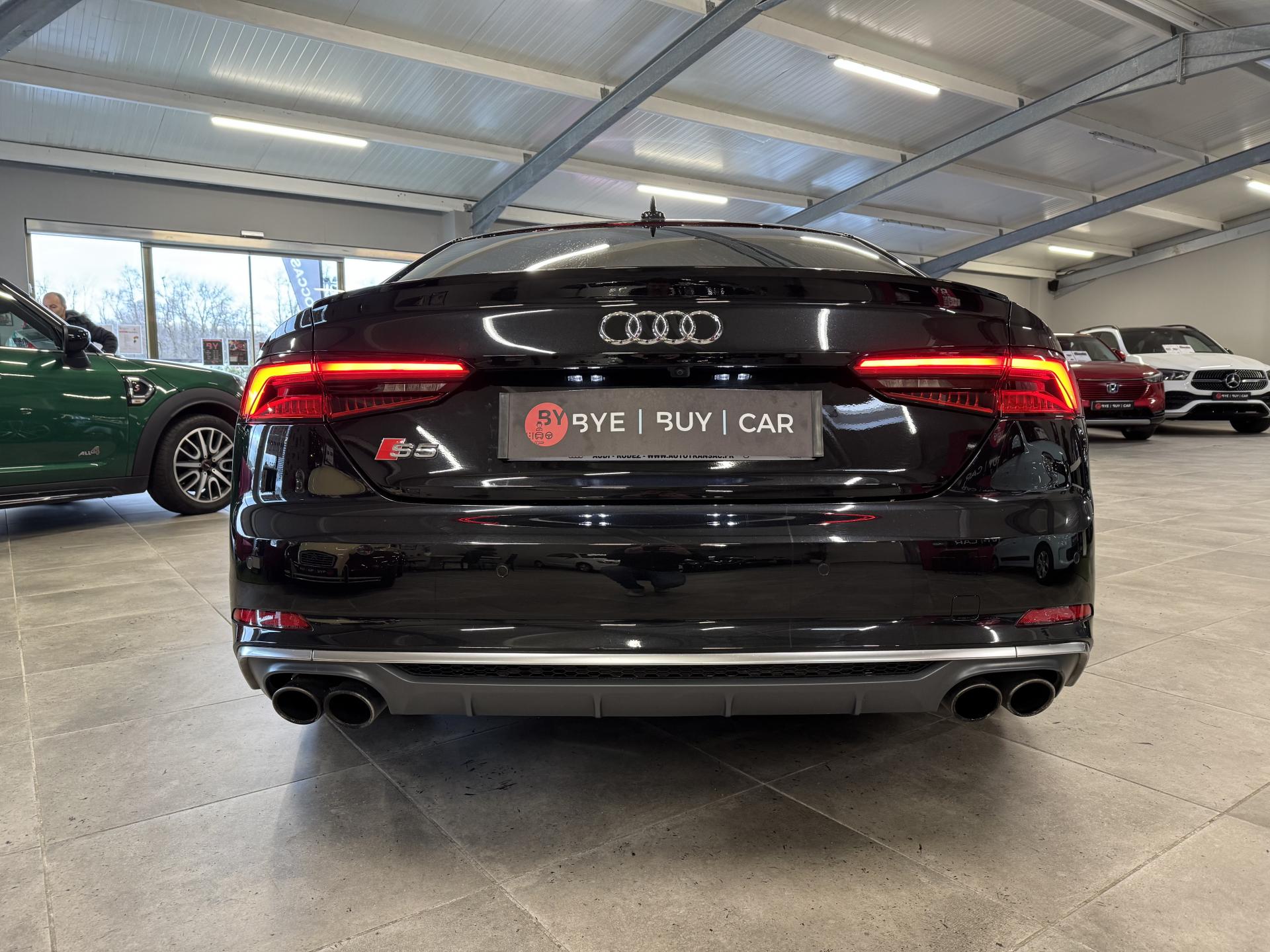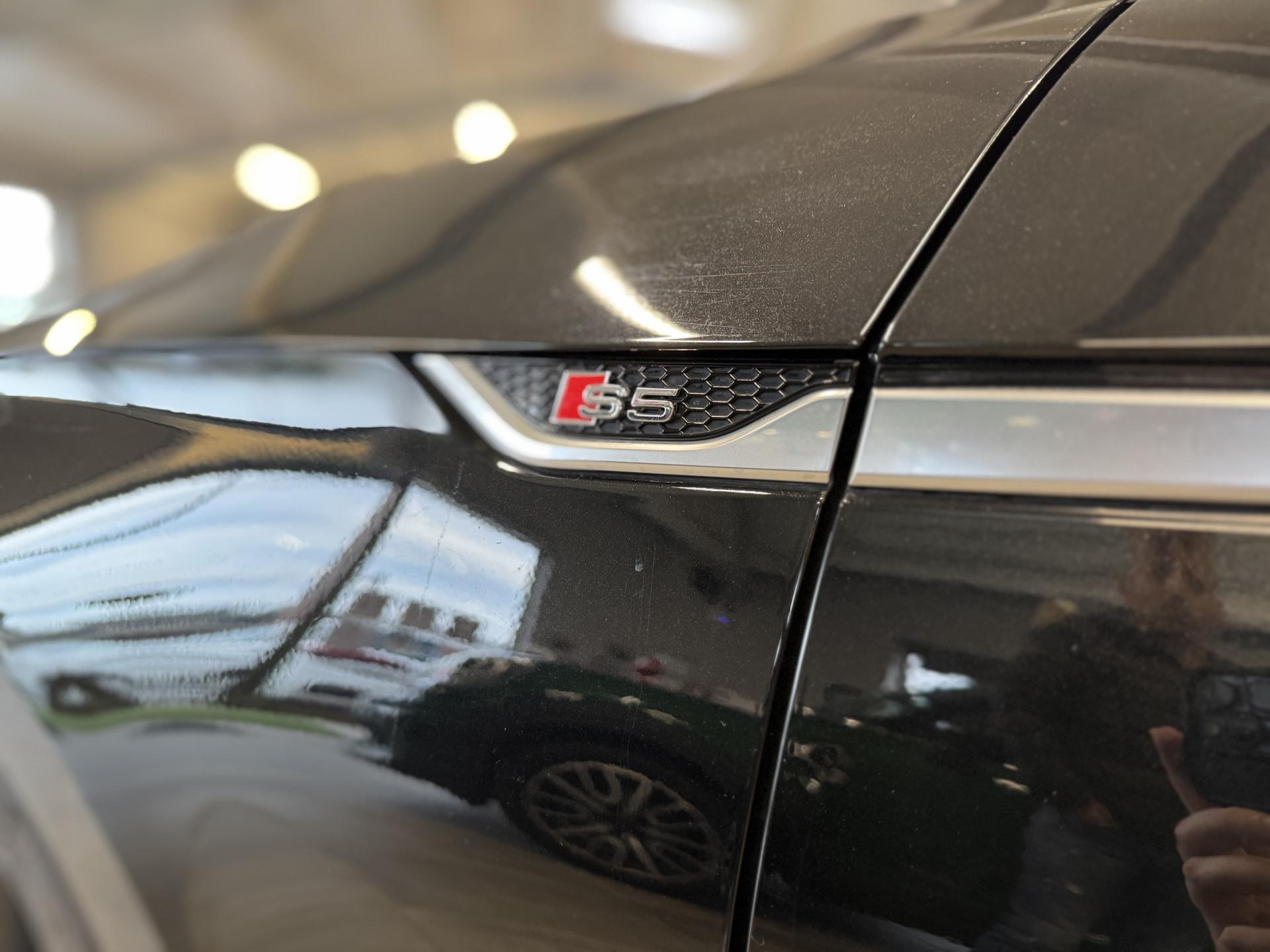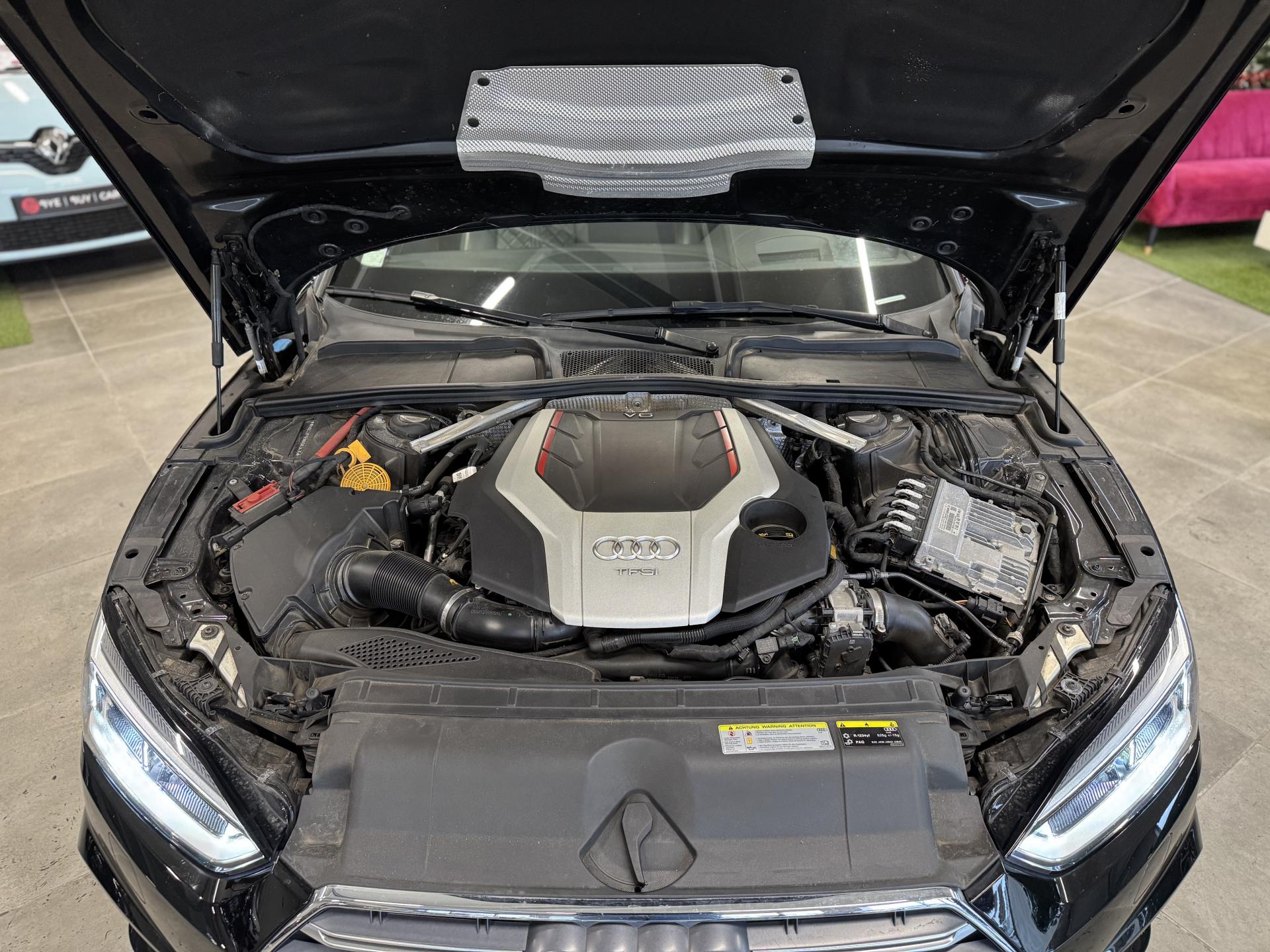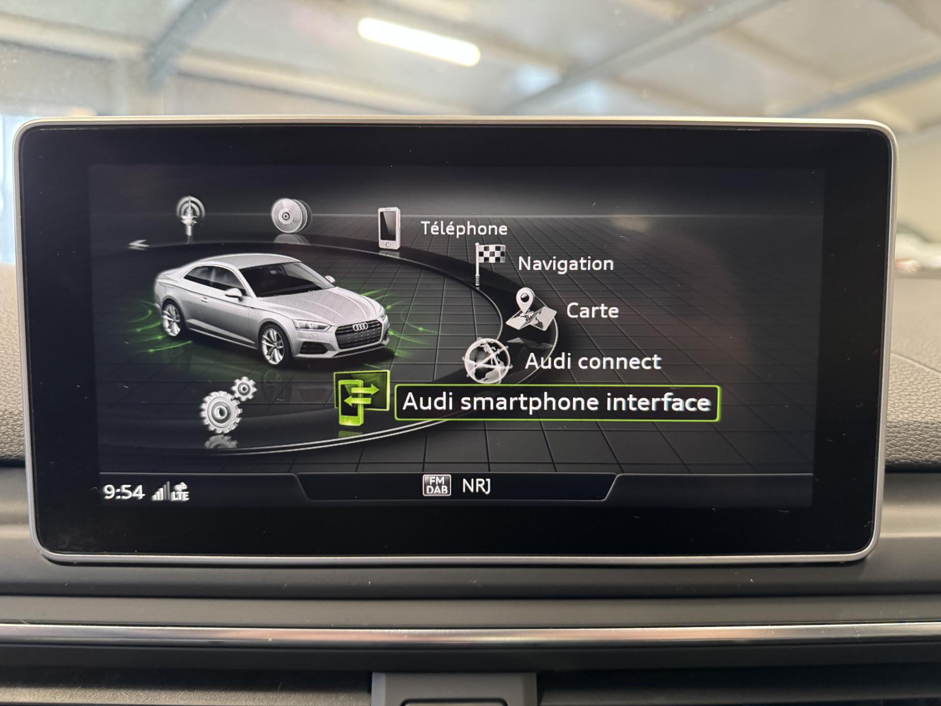 Accès ConfortAccoudoir central confort à l'avant avec inclinaison réglable et coulissant en longueurAffichage du contrôle de la pression des pneumatiquesAirbags grand volume pour le conducteur et le passagerAirbags latéraux à l'avant et système d'airbags de têteAllume cigare et cendrierAntipatinage ASR pour une motricité optimale, empêche le patinage des roues motricesApplications décoratives en aluminium brossé matAppui lombaire à 4 axes avec réglage électrique, pour les sièges conducteur et passager avant, réglage horizontal et verticalAudi connectAudi connect "Sécurité et Service"Audi Drive SelectAudi Hold AssistAudi phone box avec chargeur sans filAudi smartphone interfaceAudi sound system : 10 haut-parleurs incluant un haut-parleur central et un subwoofer ; amplificateur à 6 canaux avec une puissance totale de 180 wattsAudi Tracking System : système d'immobilisation et de localisation du véhicule par satelliteAudi virtual cockpitBlocage électronique de différentiel (EDS)Capot de coffre à ouverture automatique, en déverrouillant le coffre avec la télécommande, la touche sur la portière ou en actionnant la touche douce de déverrouillage au niveau du coffre, le capot de coffre bascule automatiquementCarrosserie galvaniséeCeintures de sécurité automatiques à trois points pour les quatre places, avec contrôle du port de ceinture à l'avant, couleur assortie à celle de l'habitacleChâssis sport SCiel de pavillon en tissu noirClé confortClimatisation automatique Confort Plus 3 zones à fonctionnalités étendues et affichage numériqueColonne de direction de sécuritéCoques de rétroviseurs extérieurs en aluminiumDésactivation de l'airbag du passager avantDétecteur de pluie et allumage automatique des projecteursDirection assistée électromécaniqueDispositif anti-erreur de carburantDossier de banquette arrière 2 places, rabattable à distance et en trois parties 40 : 20 : 40 ou complètementEclairage intérieurEcrous antivolEléments extérieurs spécifiques S : calandre singleframe avec lamelles aluminium avec logo S5, grilles d'entrée d'air latérales en chrome foncé avec applications aluminium, étriers de frein noir avec logo S5, diffuseur arrière noir avESC (contrôle électronique de stabilisation)Fixation pour sièges enfants ISOFIX et Top Tether pour les places arrière extérieuresFixation pour sièges enfants ISOFIX sur le siège passager AV avec commande de désactivation d'airbag passager AVFrein de stationnement electromécaniqueInterface BluetoothJantes en aluminium coulé Audi Sport style 5 branches doubles, finition titane mat, polies brillant, 8,5 J x 19"Navigation MMI plus avec MMI touchOutillage de bord et cricPack Assistance CityPack brillance : entourages de vitres en aluminiumPare-chocs spécifiques S style dynamique et sportifPare-soleilPhares à LED avec clignotants arrière à LED dynamiquesPréparation pour crochet d'attelageQuattro : transmission intégrale permanenteRecommandation de repos qui analyse le comportement routier au moyen de différents capteursRégulateur et limiteur de vitesseRétroviseur intérieur électrochrome sans contourRétroviseurs extérieurs avec clignotants à LED intégrésRétroviseurs extérieurs réglables et escamotables électriquement, jour/nuit automatique, dégivrants des deux côtés et buses de lave-glaces dégivrantesRoue de secours à encombrement réduitSécurité enfantsSièges avant chauffantsSièges avant réglables électriquement avec fonction mémoires pour le siège conducteurSièges Sport à l'avantSorties d'échappement chromées, visibles et doubles, une double sortie à gauche et une sortie à droiteSystème Start/Stop réduit la consommation de carburant ainsi que les émissions de CO2Tapis complémentaires à l'avant et à l'arrièreTiptronic : boîte automatique 8 rapports avec programme de commande dynamique (DSP)Triangle de présignalisation et trousse de secoursVide-pochesVitres athermiquesVolant 3 branches multifonction plus en cuir avec méplat avec logo S5