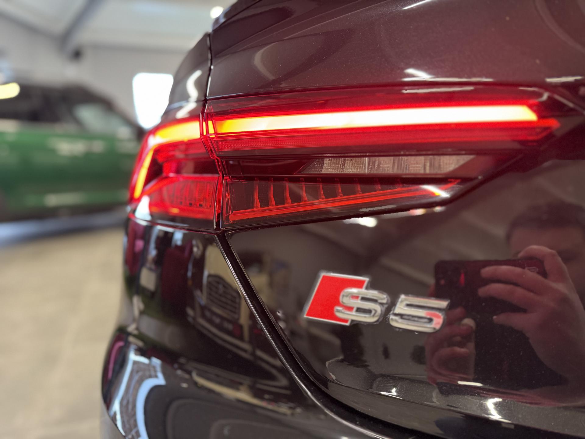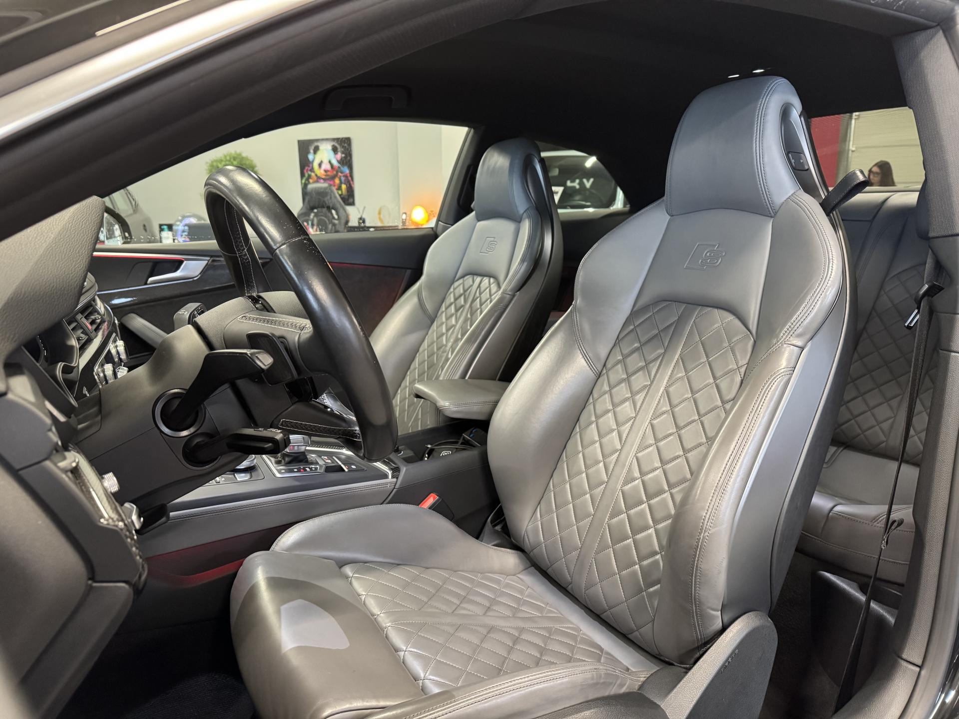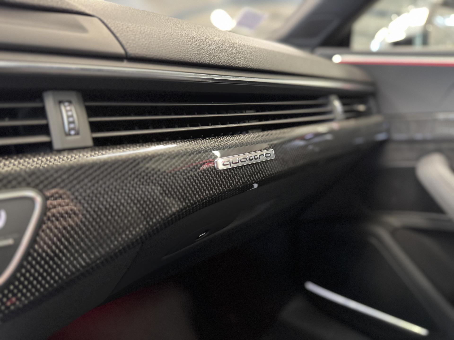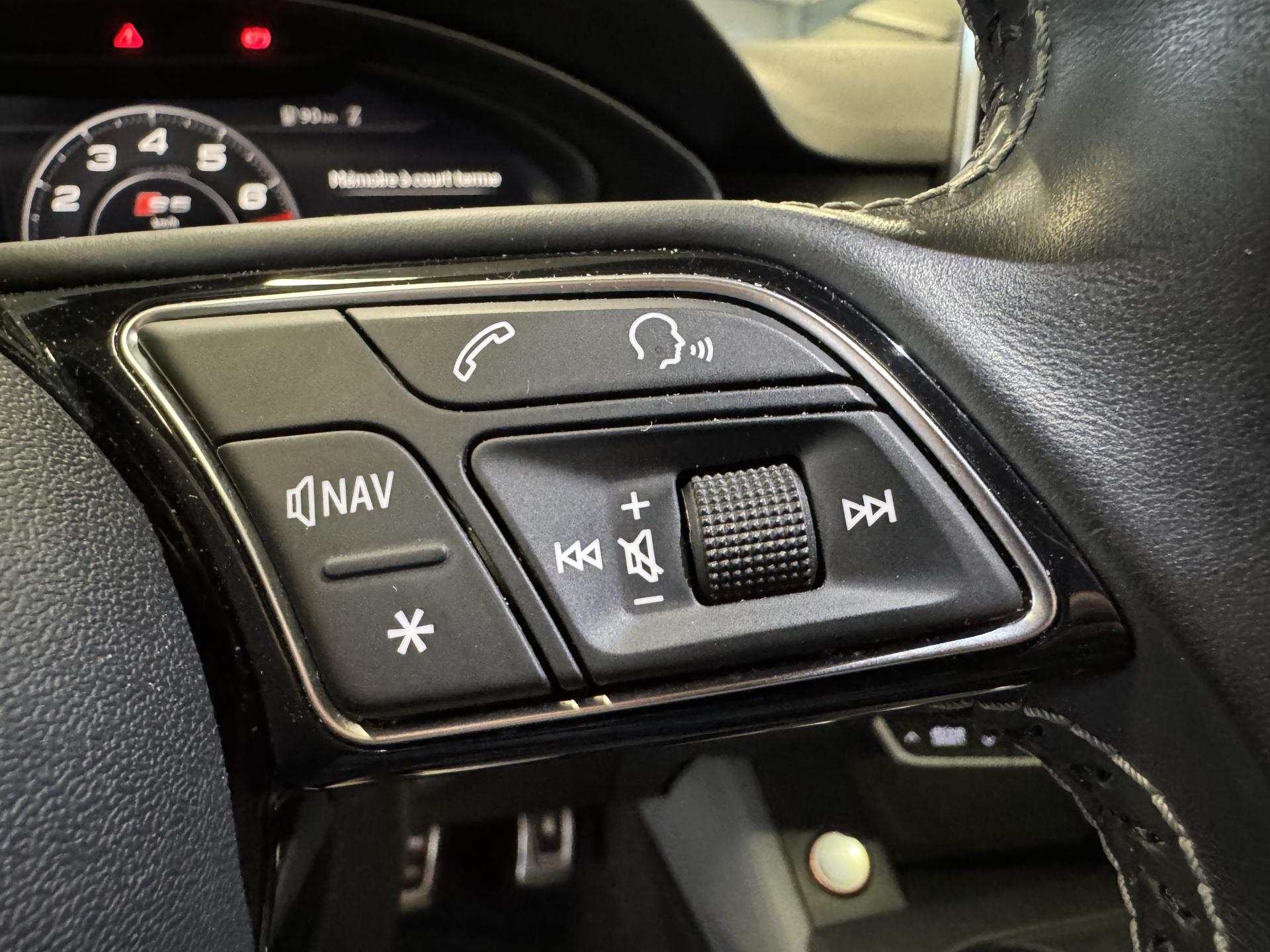 Accès ConfortAccoudoir central confort à l'avant avec inclinaison réglable et coulissant en longueurAffichage du contrôle de la pression des pneumatiquesAirbags grand volume pour le conducteur et le passagerAirbags latéraux à l'avant et système d'airbags de têteAllume cigare et cendrierAntipatinage ASR pour une motricité optimale, empêche le patinage des roues motricesApplications décoratives en aluminium brossé matAppui lombaire à 4 axes avec réglage électrique, pour les sièges conducteur et passager avant, réglage horizontal et verticalAudi connectAudi connect "Sécurité et Service"Audi Drive SelectAudi Hold AssistAudi phone box avec chargeur sans filAudi smartphone interfaceAudi sound system : 10 haut-parleurs incluant un haut-parleur central et un subwoofer ; amplificateur à 6 canaux avec une puissance totale de 180 wattsAudi Tracking System : système d'immobilisation et de localisation du véhicule par satelliteAudi virtual cockpitBlocage électronique de différentiel (EDS)Capot de coffre à ouverture automatique, en déverrouillant le coffre avec la télécommande, la touche sur la portière ou en actionnant la touche douce de déverrouillage au niveau du coffre, le capot de coffre bascule automatiquementCarrosserie galvaniséeCeintures de sécurité automatiques à trois points pour les quatre places, avec contrôle du port de ceinture à l'avant, couleur assortie à celle de l'habitacleChâssis sport SCiel de pavillon en tissu noirClé confortClimatisation automatique Confort Plus 3 zones à fonctionnalités étendues et affichage numériqueColonne de direction de sécuritéCoques de rétroviseurs extérieurs en aluminiumDésactivation de l'airbag du passager avantDétecteur de pluie et allumage automatique des projecteursDirection assistée électromécaniqueDispositif anti-erreur de carburantDossier de banquette arrière 2 places, rabattable à distance et en trois parties 40 : 20 : 40 ou complètementEclairage intérieurEcrous antivolEléments extérieurs spécifiques S : calandre singleframe avec lamelles aluminium avec logo S5, grilles d'entrée d'air latérales en chrome foncé avec applications aluminium, étriers de frein noir avec logo S5, diffuseur arrière noir avESC (contrôle électronique de stabilisation)Fixation pour sièges enfants ISOFIX et Top Tether pour les places arrière extérieuresFixation pour sièges enfants ISOFIX sur le siège passager AV avec commande de désactivation d'airbag passager AVFrein de stationnement electromécaniqueInterface BluetoothJantes en aluminium coulé Audi Sport style 5 branches doubles, finition titane mat, polies brillant, 8,5 J x 19"Navigation MMI plus avec MMI touchOutillage de bord et cricPack Assistance CityPack brillance : entourages de vitres en aluminiumPare-chocs spécifiques S style dynamique et sportifPare-soleilPhares à LED avec clignotants arrière à LED dynamiquesPréparation pour crochet d'attelageQuattro : transmission intégrale permanenteRecommandation de repos qui analyse le comportement routier au moyen de différents capteursRégulateur et limiteur de vitesseRétroviseur intérieur électrochrome sans contourRétroviseurs extérieurs avec clignotants à LED intégrésRétroviseurs extérieurs réglables et escamotables électriquement, jour/nuit automatique, dégivrants des deux côtés et buses de lave-glaces dégivrantesRoue de secours à encombrement réduitSécurité enfantsSièges avant chauffantsSièges avant réglables électriquement avec fonction mémoires pour le siège conducteurSièges Sport à l'avantSorties d'échappement chromées, visibles et doubles, une double sortie à gauche et une sortie à droiteSystème Start/Stop réduit la consommation de carburant ainsi que les émissions de CO2Tapis complémentaires à l'avant et à l'arrièreTiptronic : boîte automatique 8 rapports avec programme de commande dynamique (DSP)Triangle de présignalisation et trousse de secoursVide-pochesVitres athermiquesVolant 3 branches multifonction plus en cuir avec méplat avec logo S5