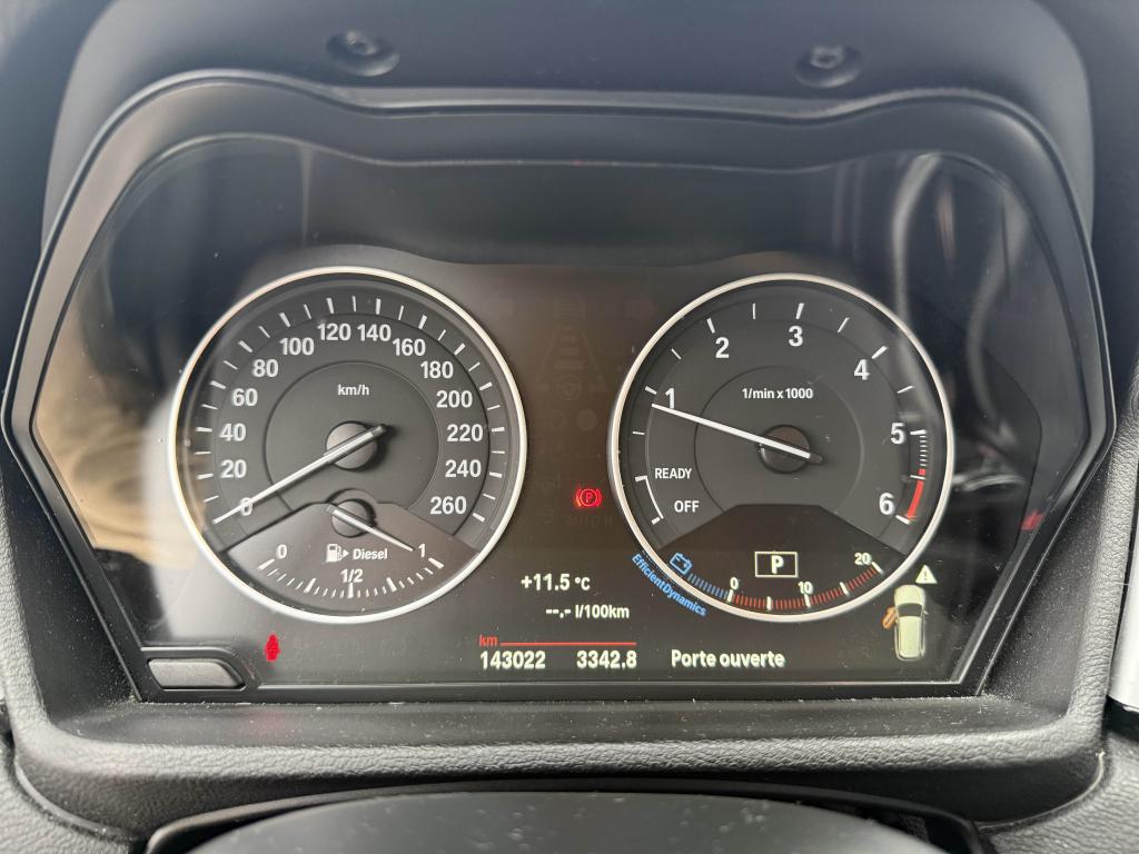 ABS (Antiblocage de roues)Accoudoir central avantAffichage BMW EfficientDynamics dans le cadran d'instrumentationAide au démarrage en côte, pré-charge du circuit de freinage au lever de pied, séchage des disques de freins et compensation du fadingAirbag passager déconnectableAirbags conducteur et passagerAirbags de tête avant et arrière avec voile de protection contre les débris de verreAirbags latéraux avantAllumage automatique des projecteursAntenne de toit « aileron de requin »Anti-démarrage électroniqueAppel d'Urgence IntelligentAppuie-tête réglable en hauteurAttention Assist : système de détection de somnolenceAutoradio BMW Professional CD, 6 haut-parleurs, prise AUX-IN, port audio USB et streaming audio Bluetooth (avec fonction "Music Search")Avertisseur de risque de collisionBaguettes de seuil de portes sigléesBanquette arrière 3 places avec dossiers rabattables en trois parties (40/20/40)BMW TwinPower TurboBoîte de vitesses automatique à 8 rapportsCalandre cerclée de chrome avec 7 barreaux verticaux noirsCarnet d'entretien électronique embarqué "BMW Service History"Ceintures de sécurité à 3 points (tous les sièges) avec prétensionneur pyrotechnique et limiteur de tension (à l'avant)Clés radiocommandées à mémorisation automatique des réglages "Personal Profile"Climatisation automatique bi-zoneConstruction allégée intelligenteContrôle de freinage en courbe CBCContrôle de la transmission pour favoriser une inscription dynamique dans le virageDémarrage sans clé via le bouton de démarrage Start/Stop avec contour chroméDétecteur de pluie ajustant automatiquement la fréquence de balayage des essuie-glaceDifférentiel à blocage électronique pour optimiser la motricitéDiffuseurs aérodynamiques avant "Air Curtain"Direction Servotronic à assistance variable en fonction de la vitesseEcran d'information central couleur 6.5" (16,5 cm) avec commande par "Controller" iDrive et 8 touches de raccourcis programmablesEcrous antivolFeux de jour à LEDFeux de stop dynamiquesFiltre à particulesFixations Isofix aux places latérales arrièreFonction d'arrêt et de redémarrage automatique du moteurFrein de parking électromécaniqueFreins à disques ventilés à l'avantIndicateur de maintenance CBS tenant compte des conditions de conduiteInserts décoratifs Oxidsilber matInterface Bluetooth pour téléphone portable (mains-libres)Jantes en alliage léger 17" style 560 à rayons en VKit de mobilité BMWKit rangementLimiteur et régulateur de vitesse avec maintien de la vitesse en descenteMesure individuelle de pression des pneumatiquesMontant central extérieur noir brillantNotice d'utilisation intégréeOrdinateur de bord avec Check-Control et indicateur de température extérieurePare-soleil avec miroirs de courtoisie conducteur et passagerPneumatiques RSC permettant le roulage à plat en relation jantes en alliage léger 19''Poignées de portes couleur carrosserieProjecteurs antibrouillard avant/arrièreProtection contre les erreurs de ravitaillementRadars de stationnement arrière PDC avec représentation graphique des obstacles sur l'écran centralRails de toit accolés au pavillonRespect de la Norme anti-pollution EU6Rétroviseurs extérieurs à réglages électriquesSécurité enfants aux portes arrièreSélecteur de mode de conduite - 3 modes : "ECO PRO", "Confort" et "Sport"Sellerie tissu "Grid"Services Après-Vente connectés BMW TeleServicesSortie d'échappement simple et rondeSystème anti-collision à basse vitesseSystème de contrôle dynamique de la stabilité (DSC+), y compris contrôle dynamique de la traction (DTC)Système de récupération de l'énergie au freinageTapis de sol en veloursTeinte de carrosserie "Schwarz" unieTouches multifonctions sur le volantTrain arrière multibrasTriangle de présignalisation avec trousse de premier secoursVerrouillage centralisé avec télécommandeVitrage teinté pour réduire l'échauffement dû à l'ensoleillementVitres avant et arrière électriques à impulsion avec système ant-ipincementVolant 3 branches gainé de cuir, réglable en hauteur et profondeurVolets d'air pilotés