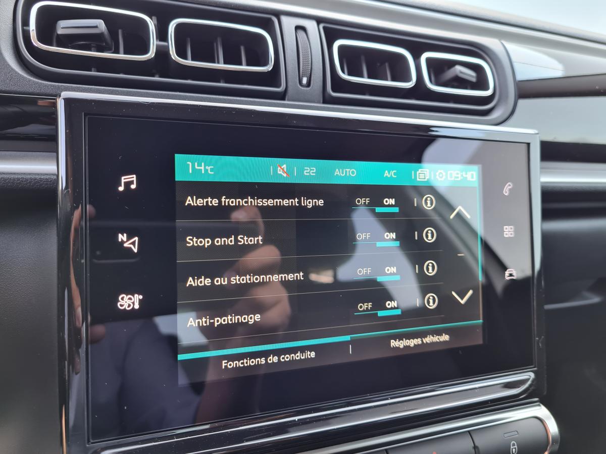 ABS avec répartiteur électronique de freinage (REF) et aide au freinage d'urgence (AFU)Accoudoir avantAide au stationnement arrièreCaméra de recul avec visualisation sur tablette tactile 7"CITROËN Connect Nav sur tablette tactile 7"Climatisation automatique avec fonction filtrage de l'airContrôle dynamique de stabilité (ESP)Détecteur de sous GonflageFeux arrière a effet 3DJantes alliage 17” VECTOR diamantées (non chaînable)Kit mains libres Bluetooth et prise USBLève-vitres arrière électriques et séquentielsLève-vitres avant électriques et séquentielsMirror ScreenPack VisibilitéProjecteurs antibrouillard avantRégulateur et limiteur de vitesseRétroviseur intérieur électrochromatique (automatique jour/nuit)Sièges Advanced ConfortSystème de fixation ISOFIX sur les sièges arrièreToit bi-ton Noir OnyxVitres et lunette arrière surteintéesVolant en croûte de cuir