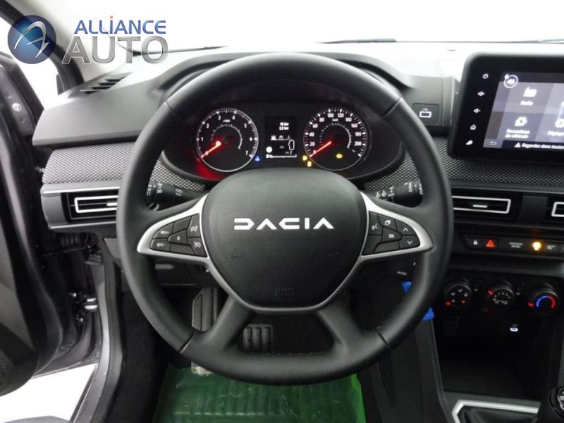 33 -23 appui-têtes ARAide au parking ARAirbag frontal conducteur et passagerAirbag frontal passager désactivableAirbag latéral AV : thorax + rideauAlerte franchissement de ligne et assistant maintien dans la voieAllumage des feux et essuie-glace automatiquesAssistance au freinage d'urgence + allumage des warningsBanquette AR avec dossier rabattable en portefeuille 1Barres de toit modulablesBoîte de vitesse manuelleBouton appel d'urgence E-callClé 3 boutonsClimatisation manuelleCluster TFTCondamnation centralisée des portesCondamnation des ouvrants en roulantConsole basse + rangement ouvertDétection de pression des pneusDirection assistéeEclairage du coffreEclairage plafonnier AREnjoliveur 16'' ATARAEnjoliveurs bas de porte coffreFeux anti brouillardFeux de jour à LEDFiltre à particulesKit de gonflageLève-vitre conducteur électrique impulsionnelLève-vitres AR électriquesMedia display (écran 8'', réplication smartphone, 4 haut-parleurs, 1 port USB)Mode éconuitOrdinateur de bordPeinture opaquePrédisposition EthylotestPrise accessoire en rang 3Régulateur de vitesseRétroviseur intérieur jourRétroviseurs extérieursRétroviseurs extérieurs réglables électriquement + dégivrantsRappel de bouclage de ceinturesReconnaissance des panneaux de signalisation avec alerte de survitesseSellerie avec surpiqures grisesSiège conducteur réglable en hauteur + accoudoir AVSignature lumineuse DACIA en Y à LEDSystème anti-blocage des roues (ABS)Système de contrôle de traction (TCS)Système de contrôle de trajectoire (ESC) et aide au démarrage en côteSystème de fixation IsofixSystème de freinage d'urgence avancé (pieton, deux-roues et intersection)Système de surveillance de l'attention du conducteurVitres, portes AR, custode et lunette AR surteintéesVolant réglable en hauteur et en profondeurVolant Soft Feel TEP
