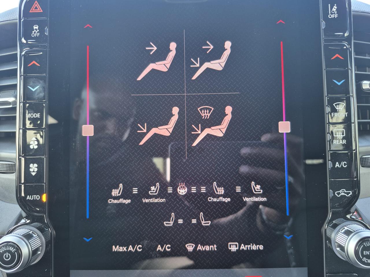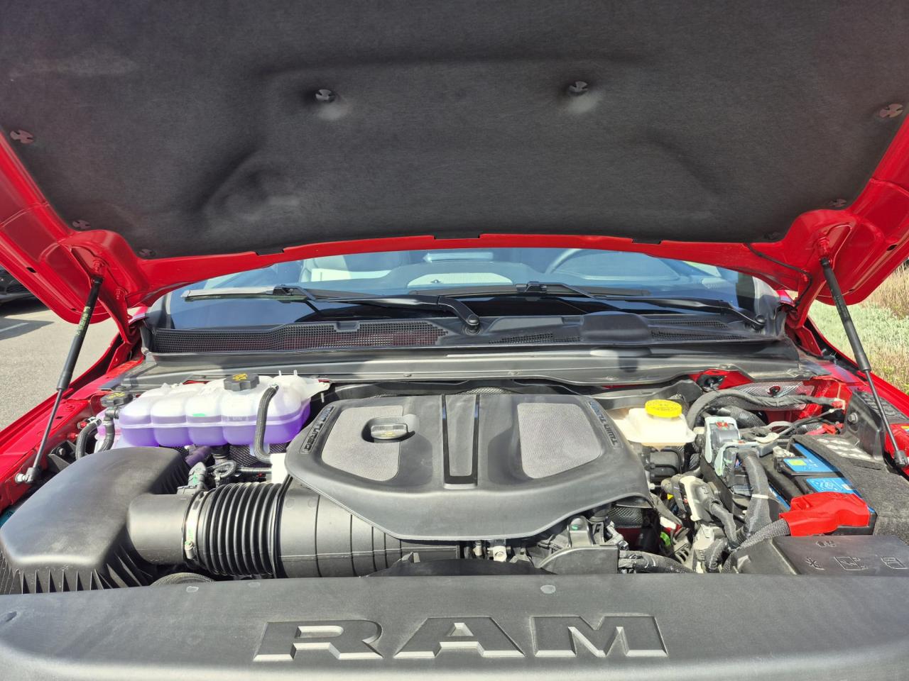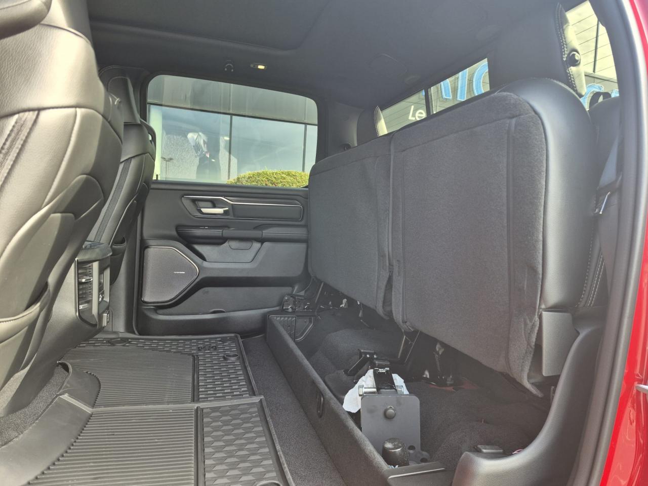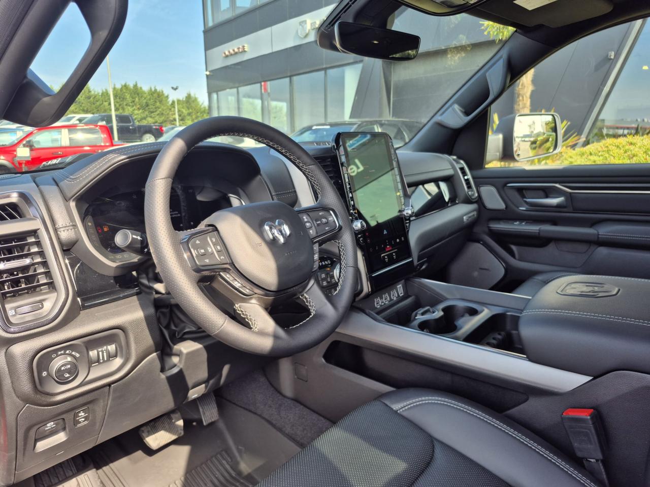 Peinture métallisée Flam Red clear coat / Peinture monotone / Capot sport performance / Calandre noire texturée / Logo RAM noir / Badging extérieur noir / Coques de rétroviseurs noires / Rétroviseurs extérieurs électriques premium couleur carrosserie / Rétroviseurs chauffants / Rétroviseur conducteur électrochrome / Rétroviseurs avec mémoire / Rétroviseurs rabattables électriquement / Éclairage de courtoisie des rétroviseurs / Éclairage d’approche / Lunette arrière coulissante électrique / Dégivrage de lunette arrière / Vitres arrière surteintées / Vitres teintées / Toit ouvrant panoramique double panneau /