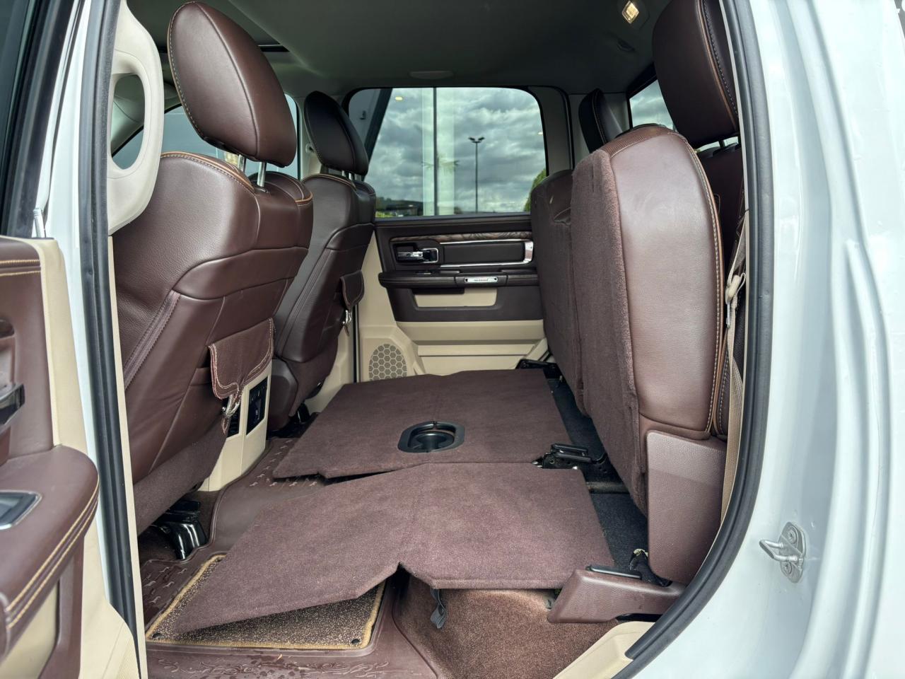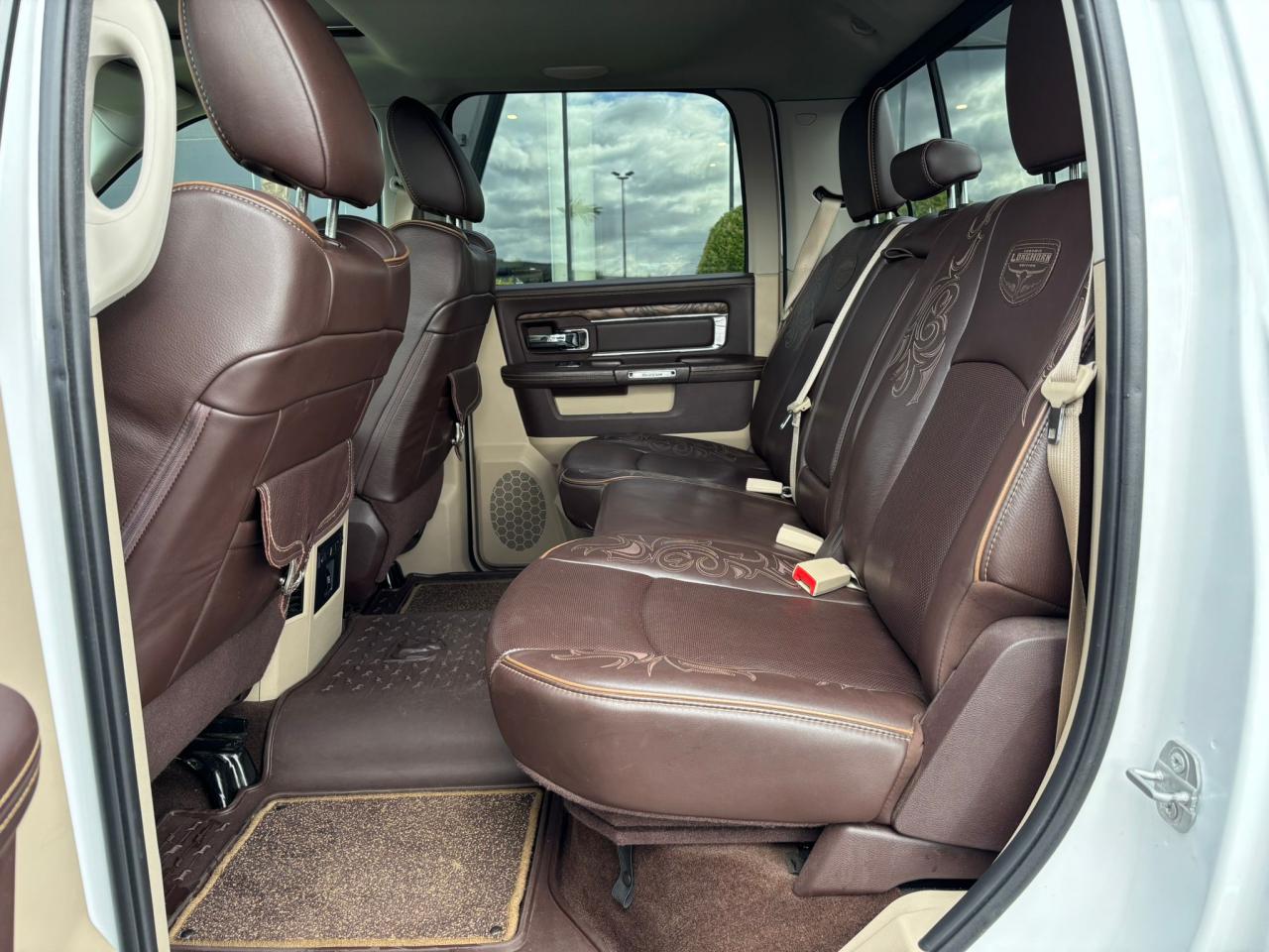 CBF : Panneaux de portes premium / CB9 : Bacs de rangement sous plancher 2ème rangée / CK3 : Tapis de sol avant et arrière type luxe / CUN : Console de pavillon / CUE : Compartiment de rangement sous les sièges arrière / CVT : Console centrale premium toute longueur / JAX : Instrumentation spécifique Laramie Longhorn / JDC : Compteur principal 200 km/h / JEC : Inserts intérieurs Longhorn / JFJ : Indicateur température et boussole / LAZ : Centre d'information conducteur / LBC : Éclairage boîte à gants / LB1 : Éclairage accentué porte avant / LB2 : Éclairage accentué porte arrière / LCJ : Éclairage intérieur à LED / LHE : Plafonnier arrière avec interrupteur / LET : Ordinateur de bord / LEV : Mémorisation radio, siège conducteur, miroirs et pédales / LMP : Rétroviseurs extérieurs avec mémoire / LEM : Rétroviseurs extérieurs avec éclairage d'accueil / LEB : Rétroviseurs extérieurs avec clignotants intégrés / X81 : Module tableau de bord / X82 : Module portes / X83 : Module avant / X8Z : Module de sièges / C1H : Sélecteur de vitesses rotatif chromé / GX4 : Démarrage sans clé / JRFP : Siège conducteur à réglage électrique 10 positions avec mémoire, passager 6 positions / JPWP : Soutien lombaire électrique / CAJ : Sièges avant ventilés / CMAP : Sièges avant chauffants / JPZ : Sièges arrière chauffants / CSX : Banquette arrière rabattable 60/40 / CVN : Plancher arrière plat rabattable / *XJ : Sellerie cuir filigrané premium / -U1 : Intérieur Canyon Brown/Light Frost Beige /