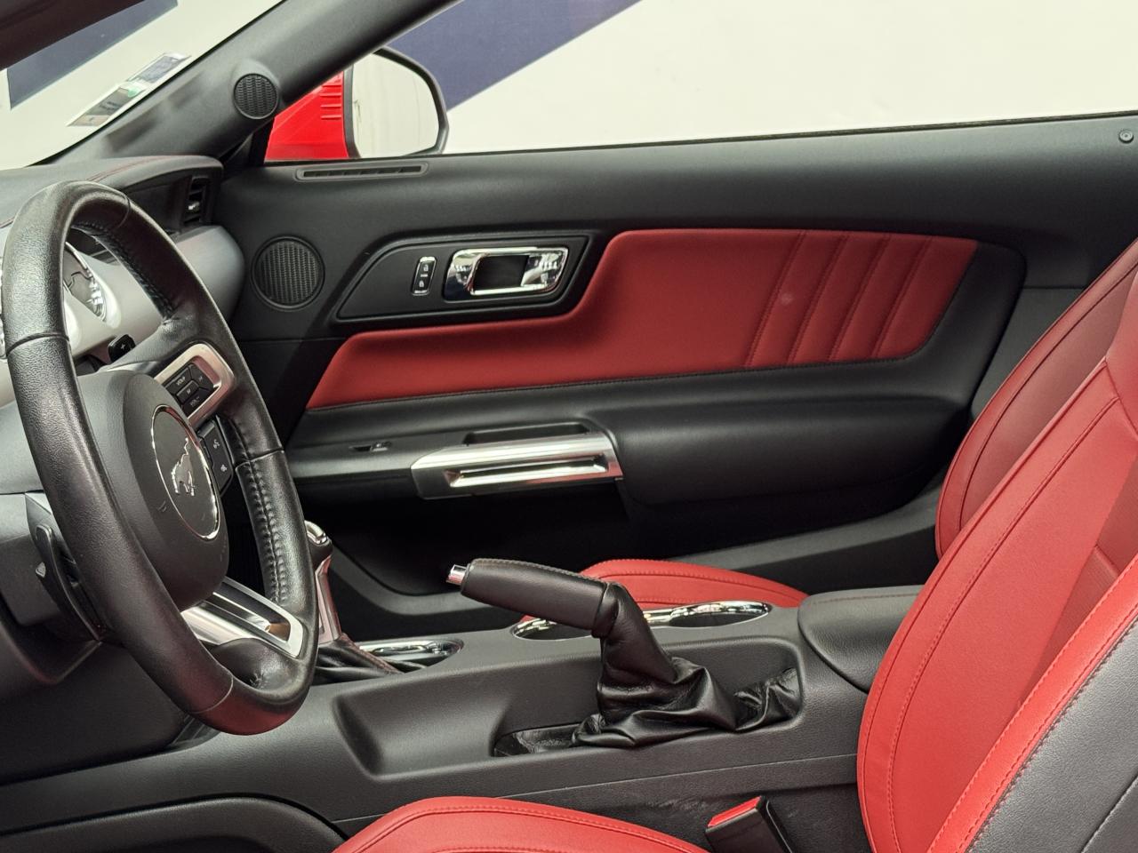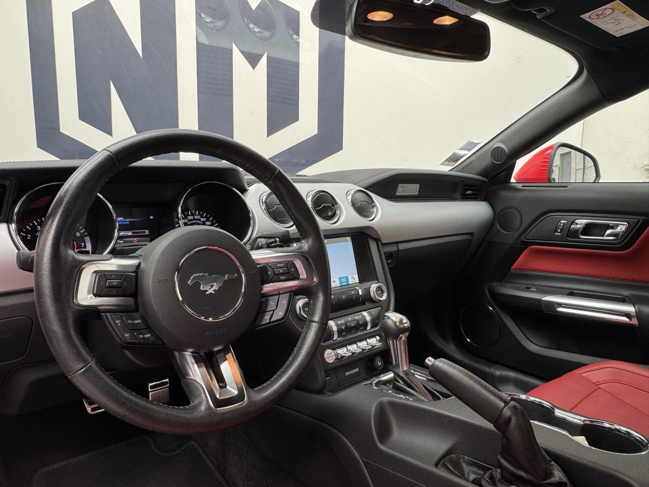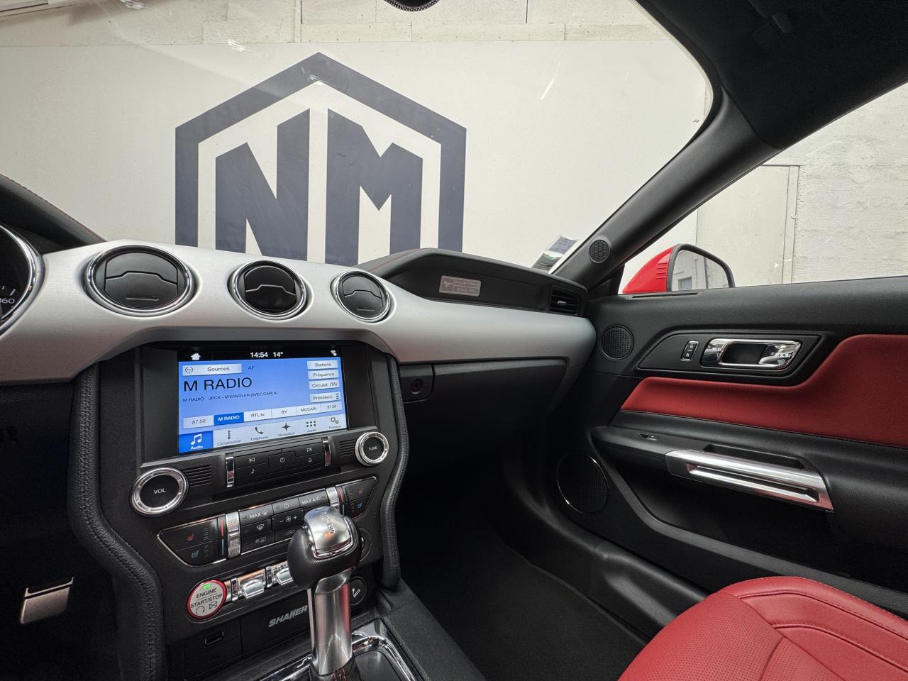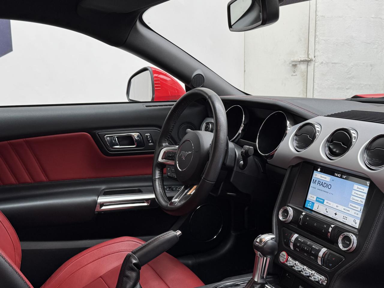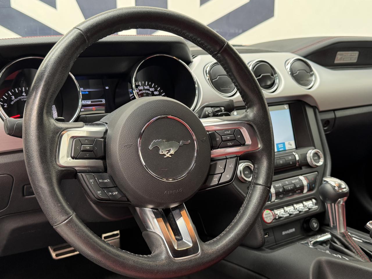 2 porte-gobelets4 modes de conduite paramétrables (Normal, Sport+, Track et Neige)ABS avec répartiteur de freinage EBDAccoudoir central avantAide au démarrage en côteAirbag genoux conducteurAirbags frontaux et latéraux avantAirbags rideauxAlarme périmétrique et volumétriqueAllumage automatique des essuie-glacesAllumage automatique des projecteursAntidémarrageAssistance au freinage d'urgenceCaméra de reculCerclage chromé des haut-parleurs intégrés aux portes, porte-gobelets, buses de ventilation et des compteursClimatisation automatique bi-zoneContrôle de pression des pneus ( TPMS )Différentiel à glissement limitéDouble sorties d'échappement chroméeEclairage d'entrée avec projection du "Pony" sur le solEclairage d’ambianceEcrous antivolESP AdvanceTracExtracteurs d'air arrièreFeux arrière à LEDFrein à main gainé de cuirFreins avant Brembo 6 pistonsGrille de calandre GTInserts façon aluminium sur la planche de bordJantes alliage noires 19'' 10x2 branches avec pneus avant 255/40 R19 et arrière 275/40 R19Keyfree System - Système d'entrée et de démarrage mains libresKit de réparation pneumatiqueLine-Lock (verrouilage du train avant)My KeyOrdinateur de bord couleur 4,2"Pack FumeurPalettes au volantPédalier en aluminiumPeinture non métalliséePhares bi-xénonProjecteurs antibrouillardRégulateur de vitesseRétroviseur intérieur électrochromeRétroviseurs extérieurs électriques et chauffants couleur carrosserie avec répétiteur de clignotantSellerie Cuir CeramicSeuil de portes rétro-éclairésSièges avant sportSièges conducteur et passager sport à réglages électriques 6 directions avec réglages lombaire intégrésSpoiler avantSuspension arrière indépendanteSuspensions sportSystème multimedia Ford SYNC 3 avec interface Bluetooth et commandes vocales avancées, écran couleur tactile 8", 9 HP et 2 ports USB - Intègre Applink,Apple Carplay et Android AutoTapis de sol avantTrack appsTrappe à carburant Ford EasyFuelVerrouillage centraliséVitres électriques avant à impulsion et fermeture globaleVolant cuir réglable en hauteur et profondeur avec commandes au volant