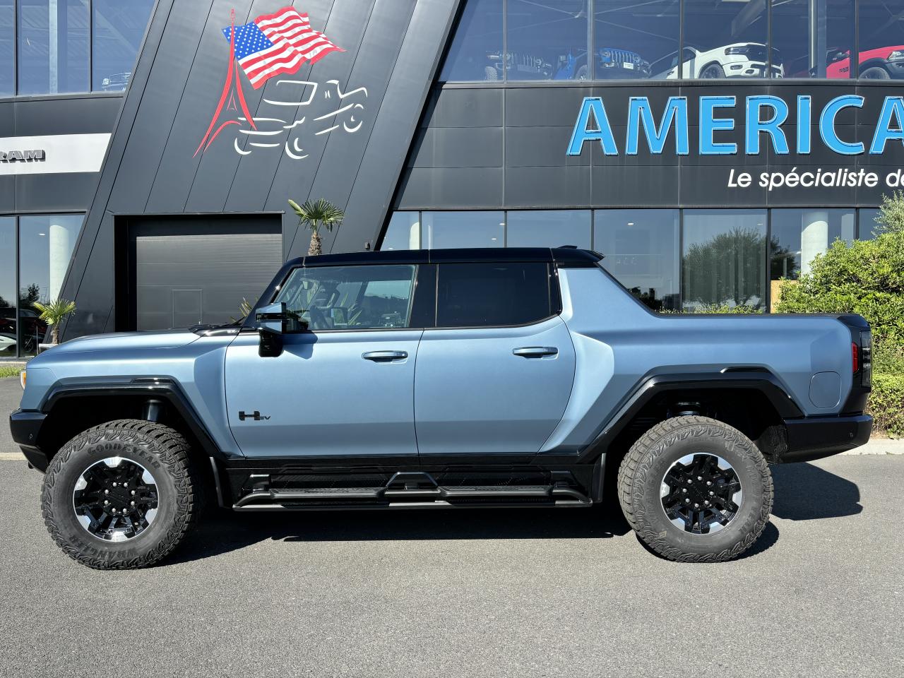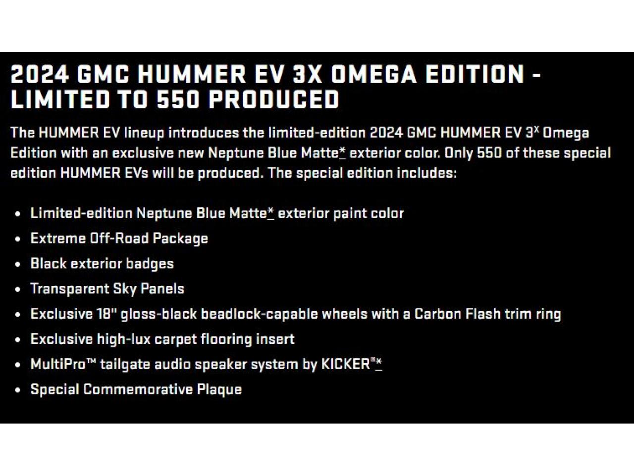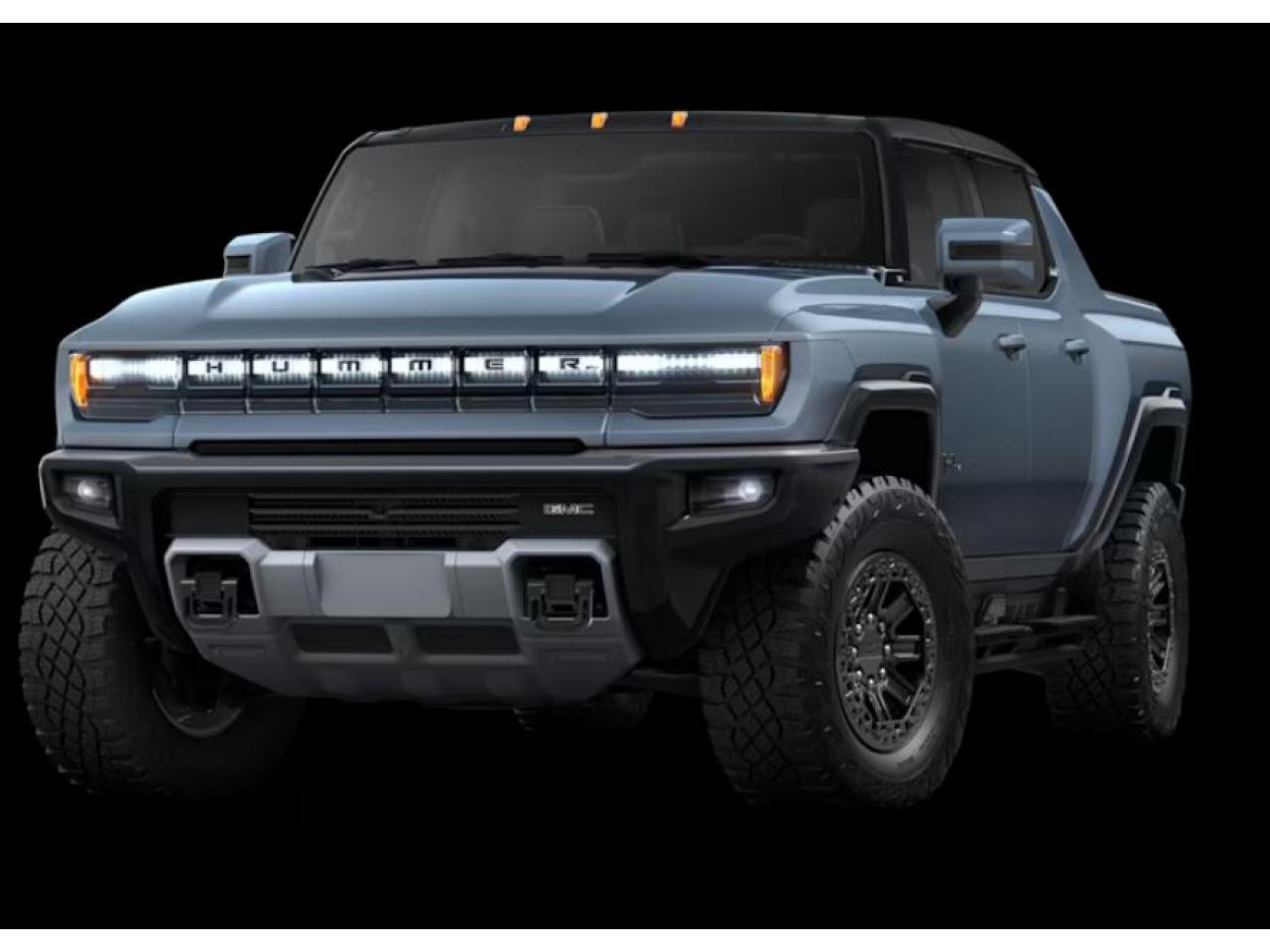 Couleur extérieure bleu Neptune mat / Emblèmes noirs / Verrous de roue Thatcham / Roue de secours à verrou de talon de 18 pouces noir lustré avec anneau décoratif éclair de carbone / Cache-moyeu de roue noir avec logo HUMMER EV / Tapis protecteurs avec empiècement de moquette de qualité supérieure /