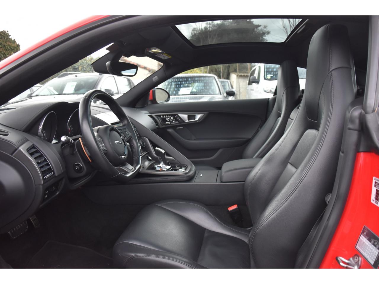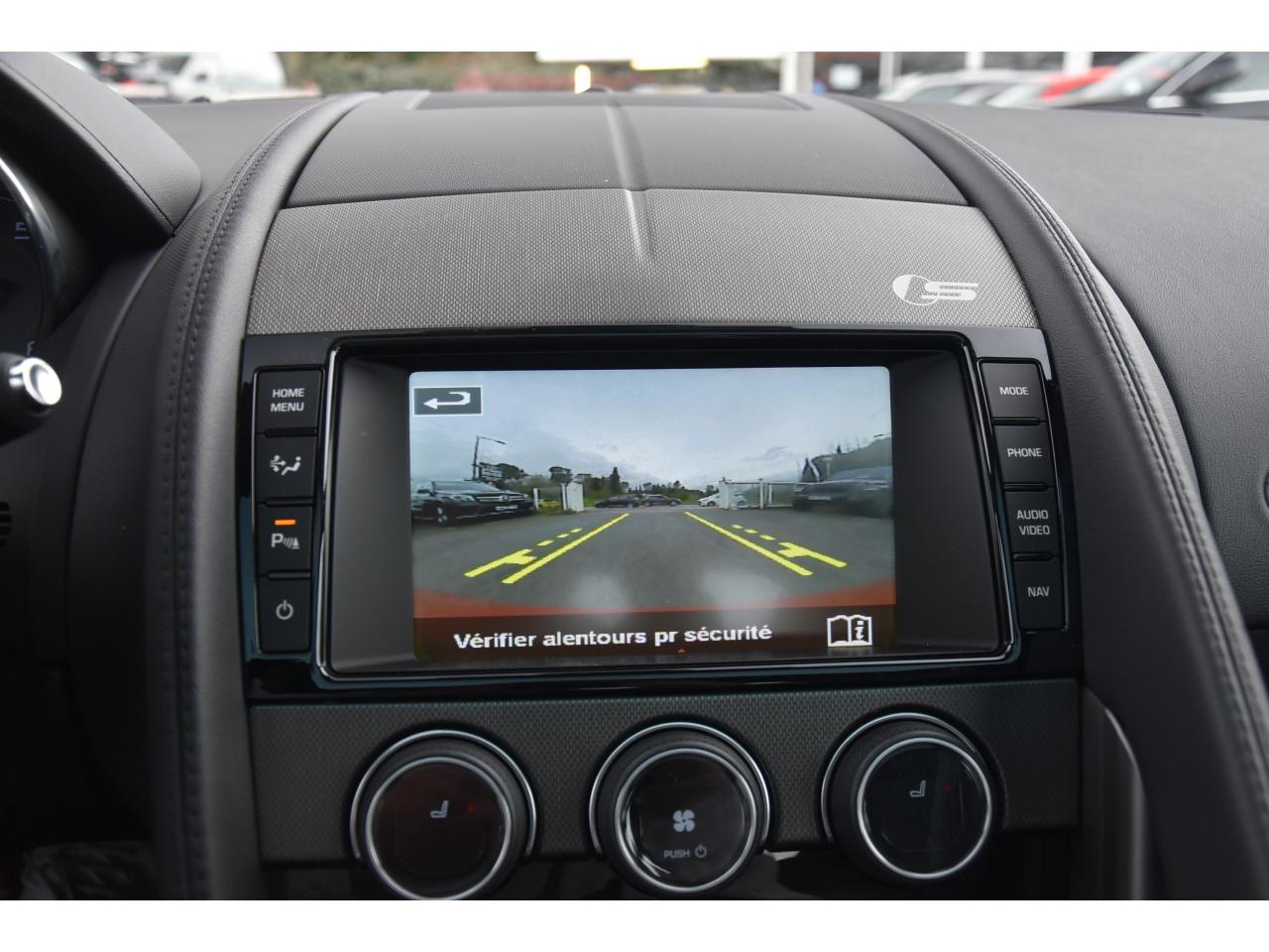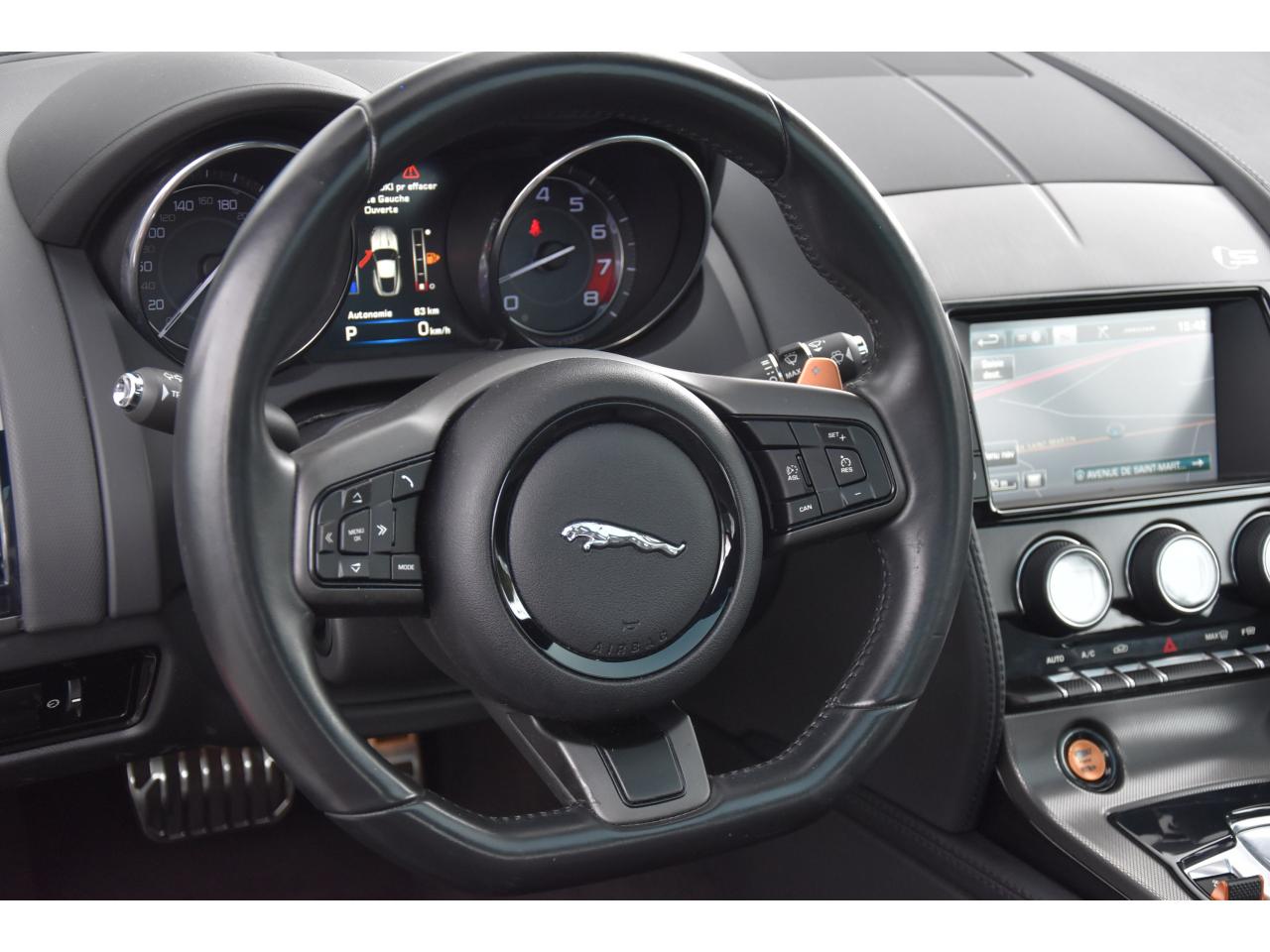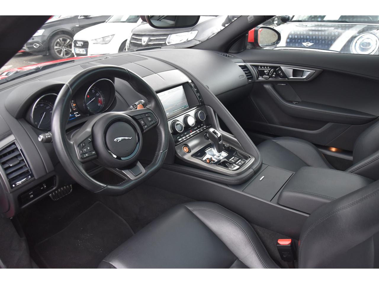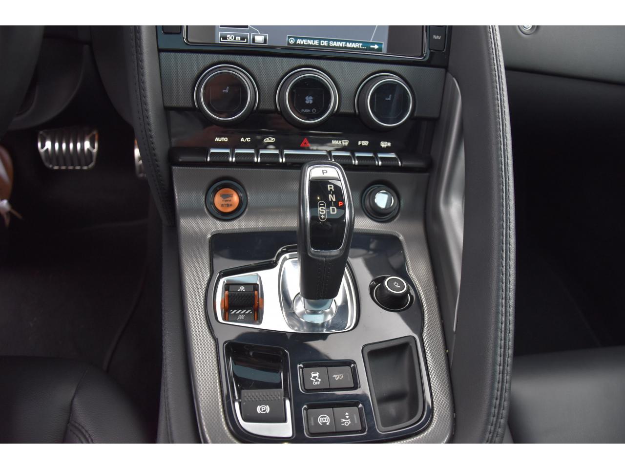 2 Prises 12VAllumage automatique des projecteursClimatisation automatique avec ouïes centrales escamotables électriquementColonne de direction réglable électriquementContrôle de pression des pneus ( TPMS )Contrôle dynamique de la stabilité DSC déverrouillableDifférentiel à glissement limitéDifférentiel ouvertDouble porte-verreDouble sortie d'échappement centraleDynamique de conduite configurable avec menu spécifique via l'écran tactileEchappement Sport actifEclairage intérieur ambiant modulable - 5 tons : du bleu phosphorescent au rougeEcran tactile 8'' à affichage couleurEssuie-glace à déclenchement automatiqueEtriers de freins noirsFilet de rangement entre les 2 siègesFinition Dark Hex Aluminium avec logo ‘‘S''Finition Ignis sur les palettes du volant, les boutons de démarrage et de mode de conduiteFinition noire brillante sur les appendices avant et arrièreFinition noire brillante sur les grilles de calandre et le bas de pare-chocs arrièreFinition noire brillante sur les ouïes d'aération du capotFinition noire brillante sur pare-chocs et sur les ouïes latéralesFrein de stationnement électronique - desserrage automatique au démarrageFreins Haute Performance (380mm à l'avant et 325mm à l'arrière)Interface media avant avec prise auxiliaire et prise USBJaguar Smart Key System, avec démarrage sans cléJantes 19'' Propeller avec étriers de freins noirsLève-vitres électriques à impulsionLogo ‘‘S'' sur l'arrièreLogo F-TYPE sur l'arrièreOrdinateur de bord avec affichage central de 5''Phares Xenon avec feux de jour à LED et lave-phares / Feux arrière à LEDPoignées de portes escamotablesRadio AM/FM et lecteur CD/MP3Rétroviseur intérieur électrochromeRétroviseurs extérieurs chauffants, réglables électriquement avec rappel de clignotantsSélecteur de vitesse séquentiel et palettes montées au volantSièges sport en suédine et cuir, réglables en 6 directions (hauteur de l'assise et inclinaison du dossier - électriquement, avant/arrière - manuellement)Spoiler arrière à déploiement automatiqueSuspensions Sport à amortissement adaptatifSystème ABS, aide au freinage d'urgence et répartiteur électronique de la force de freinageSystème audio Jaguar 180W à 6 haut-parleursSystème de Réparation de Pneu JaguarTechnologie Stop/StartTransmission automatique ‘QuickShift' à 8 rapports avec mode Hiver et mode DynamiqueVolant 3 branches en cuir avec palettes Ignis
