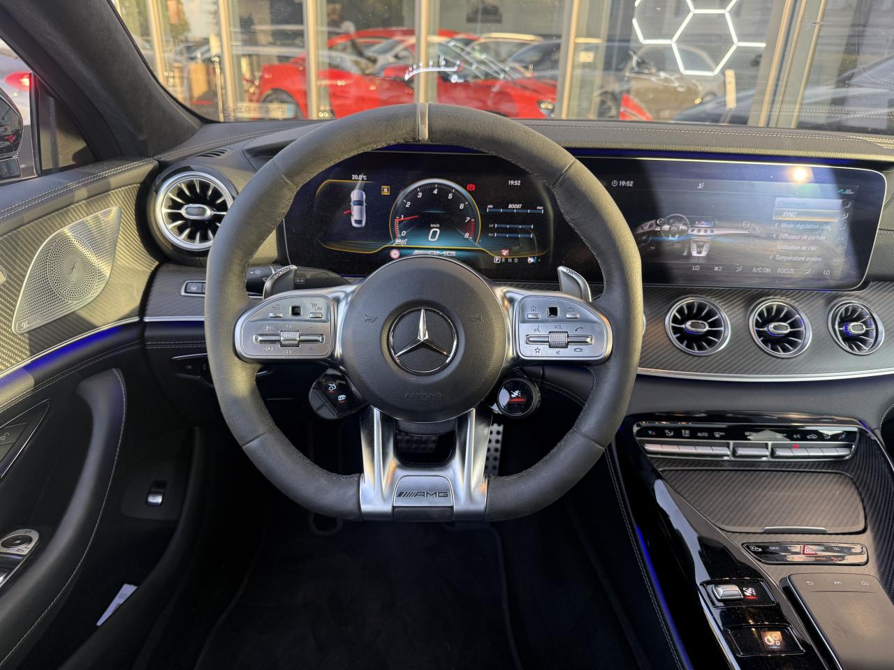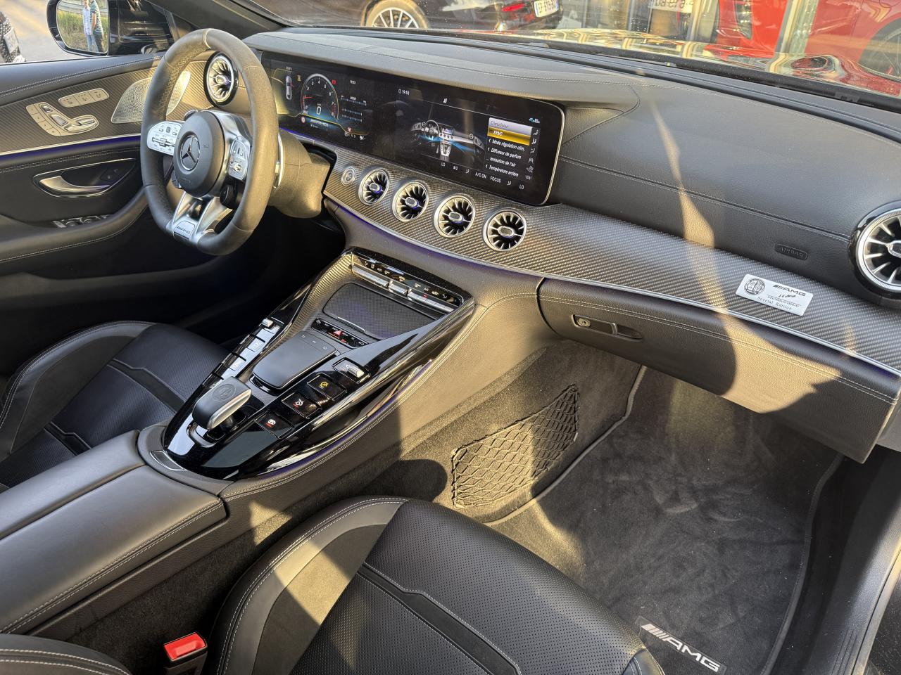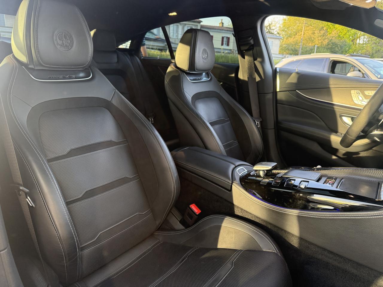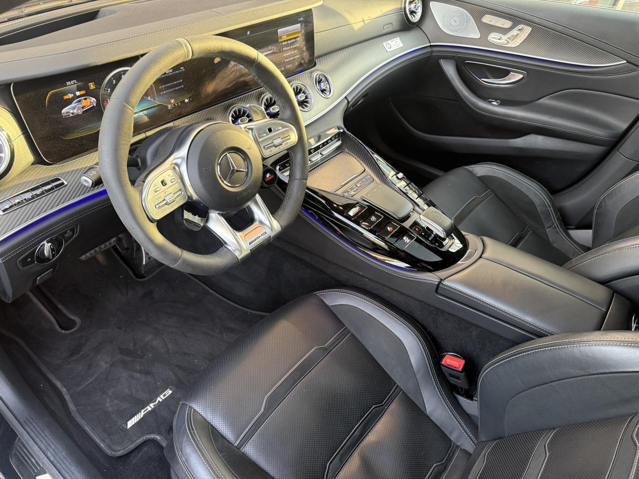 ADAPTIVE BRAKE avec fonction HOLD et aide au démarrage en côte, préremplissage et séchage des freins par freinage en cas de pluieAérodynamisme actif avec AIRPANEL sur la jupe avant et déflecteur arrière extractible à commande électriqueAffichage du non bouclage des ceintures de sécurité aux places arrièreApplication AMG Track PaceBaguettes de seuil éclairées avec inscription AMGBoîte de vitesses 9G SPEEDSHIFT MCT AMG avec fonction RACE STARTBossage du capot moteurBoutons AMG sur le volantCapot moteur actif pour la protection des piétonsClé principale avec blason « AMG »Climatisation automatique THERMATIC à 2 zonesCombiné d'instruments AMG gradué jusqu'à 360 km/h avec menu principal AMG, chronomètre de course (RACETIMER) et styles d'affichage "Classique", "Sport" et « Supersport »Combiné d'instruments WIDESCREEN composé de deux écrans de 31,2 cm (12,3")Contrôle de pression des pneus ( TPMS )Déflecteur arrière à déploiement électriqueDétecteur d'angle mortDirection active de l'essieu arrière AMGDirection paramétrique AMG à 3 niveauxDoubles sorties d'échappement trapézoïdales traitées en chrome brillant à gauche et à droiteDRIVE UNIT AMG façon V8 avec 8 touches à pictogramme au graphisme soigné, élément de commande capacitif, levier sélecteur avec blason AMG estampé, vaste bordure chromée argentée et partie interne en laque noireDYNAMIC SELECT AMG avec programmes de conduite « Chaussée glissante », « Comfort », « Sport », « Sport+ », « RACE » avec « drift mode » et « Individual »Eclairage d’ambiance 64 couleurs, 10 ambiances chromatiques et 2 effetsESP AMG à 3 modesEssuie-glace à déclenchement automatiqueFeux arrière à LED tout en longueur avec clignotants à défilementFreinage d'urgence assisté actifGrille de calandre propre à AMGHayon mains libres (motorisé, s'ouvre et se ferme d'un mouvement du pied)Intégration pour smartphone avec Apple CarPlayKEYLESS-GO : système de démarrage sans cléKit anti-crevaison TIREFITLogo sur hayonLogos sur ailes avantOuverture et fermeture confortPack DYNAMIC PLUS AMGPack StationnementPavé tactile Touchpad sur la console centralePRE-SAFE : système de sécurité préventive avec enrouleurs de ceinture à rétracteur réversible et fermeture automatique des ouvrantsPrise 12V dans le coffreProjecteurs MULTIBEAM LED avec assistant de feux de route adaptatifs PlusRangement intégré à l'accoudoir centralRéglage et suivi du véhicule à distanceSièges avant chauffantsSièges avant, colonne de direction et rétroviseurs extérieurs tout électrique avec fonction MémoiresSièges sport AMG en cuir Nappa noir avec surpiqûre contrastée gris cristal, blason AMG estampé sur les appuie-tête et enjoliveur chromé argenté avec inscription « AMG »Système antiblocage de roues (ABS)Système d'Appel d'Urgence Mercedes-BenzSystème d’échappement commutable AMG PerformanceSystème de freinage composite hautes performances avec disques de 390 mm à l'avant et 360 mm à l'arrièreSystème de sonorisation Surround Burmester avec 14 haut-parleurs pour une puissance de 640 WSystème de stabilisation en cas de vent latéralTapis de sol AMGTrain de roulement AMG RIDE CONTROL+Transmission intégrale variable 4MATIC+ Performance AMGVide-poche avant avec prise 12 VVitres latérales arrière et lunette arrière teintéesVolant Performance AMG en microfibre DINAMICA noire avec méplat dans la partie inférieure, boutons Touch-Control, repère à 12 heures, inscription « AMG », palette de changement de rapport chromées argentées et touches AMG
