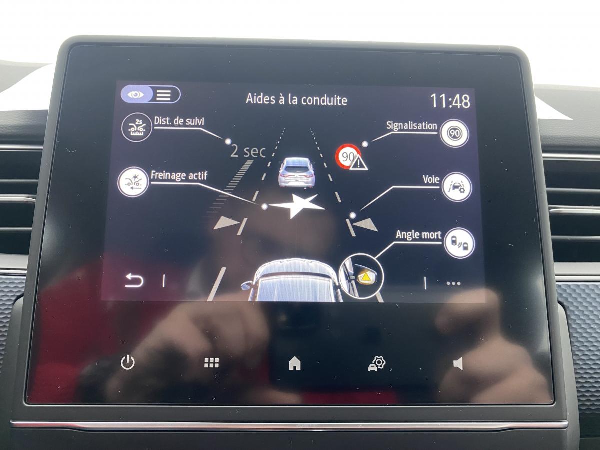 2 prises USB à l'arrièreAérateurs arrièreABS, Aide au Freinage d'Urgence (AFU)Accoudoir central avant avec rangement ferméAide au démarrage en côteAirbag frontaux conducteur et passager, désactivable côté passagerAirbags latéraux AV / ARAlerte de franchissement de ligneAlerte de survitesse avec reconnaissance des panneaux de signalisationAlerte distance de sécuritéAntenne type «requin»Appel d’urgence automatique en cas d’accidentBanquette rabattable 2/3 - 1/3 rang 2 avec isofixBluetoothCaméra de reculCapteurs de pluie et de luminositéCarte Renault, accès et démarrage « mains-libres »Climatisation automatiqueConnexions Apple CarPlay et Android AutoConsole centrale avec espace de rangementContrôle de trajectoire ESPEASY LINK 7" : Système multimédia connecté avec écran 7"Feux de jour LED C-ShapeFrein de parking assistéFreinage actif d'urgence avec détection des piétons et cyclistesJantes Alliage 17’’ Bahamas Diamantées NoiresLève-vitres avant et arrière électriquesPeinture BlancPlancher de coffre amovibleProjecteurs avant Full Led Pure VisionPurificateur d'airRégulateur et limiteur de vitesseRétroviseurs extérieurs à réglages électriques, dégivrants et rabattables automatiquementSièges avant à réglage manuelSystème d'aide au parking avant et arrièreSystème de surveillance de la pression des pneusTableau de bord avec écran numérique 4,2” et compteurs analogiquesTraitement sonore Arkamys Classic avec 6 haut-parleursVolant gainé en similicuir Soft Touch réglable en hauteur et profondeur