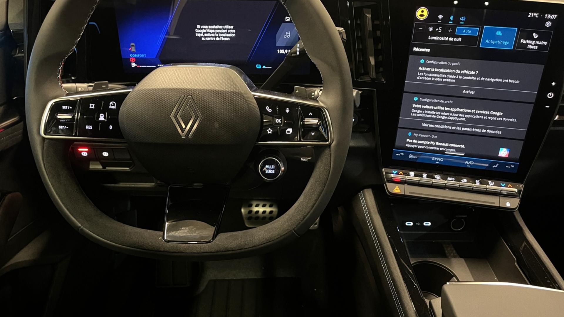 4Control advanced6 haut-parleurs7 placesAccès et démarrage mains-libresAccoudoir central et inserts de portes en textile enduit grainé avec surpiqûres argentAide au maintien dans la voieAide au parking avant, arrière et latéralAvertisseur d'angle mort et prévention de sortie de voie en cas de dépassementAvertisseur de changement de voieAvertisseur de sortie de stationnement en marche arrière avec freinage d'urgence automatiqueBadge esprit AlpineBanquette arrière coulissante sur 22 cmBarres de toit noir matifiéCaméra de reculCapteur de pluieChargeur de smartphone par inductionClimatisation automatiqueContour des vitres chroméFeux arrière à LED effet moiré 3D et avec clignotant à défilementFeux avant LED Adaptative VisionFeux LED adaptive vision (avec fonction antibrouillard intégrée)Frein de parking électrique avec fonction Auto-HoldFreinage d’urgence automatique urbain/péri-urbain avec détection piétons et cyclistesHayon électrique mains libresJantes alliage 20" Daytona diamantées noir avec vernis fumé grisLimiteur de vitesseLogo avant et arrière ice blackOpenR link 12” : système multimédia connecté avec Google intégré incluant pack navigation (Google Maps et Google Assistant) pendant 5 ans, et pack infotainment (Google Play)Pack contrôle à distance (via l’application My Renault) inclus pendant 5 ansPédalier en aluminiumRégulateur de vitesse adaptatif intelligent (i-ACC)Renault MULTI-SENSE (choix des modes de conduite)Réplication smartphone compatible Android Auto & Apple CarPlayRétroviseur intérieur électrochrome sans contourSellene mixte tissu carbone/Alcantara avec surpiqûres bleuesSéquence d’accueil dédiéeSièges avant réglables manuellementSon auditorium ArkamysSystème de reconnaissance des panneaux de signalisation avec alerte de survitesse (inclus pendant 14 ans)Système de surveillance de la vigilance du conducteurSystème OpenR Link avec écran tactile 12" et navigation Google Maps, Google Play et Google AssistantVitres arrière surteintéesVolant spécifique avec insert Alcantara
