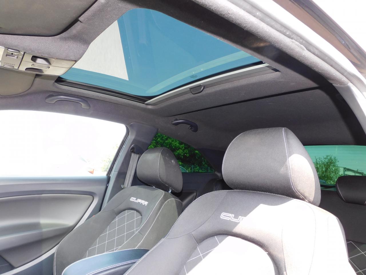 2 Fixations ISOFIX + Top-Tether à l'arrière pour ancrage de sièges enfantAllumage automatique des feux et des essuie-vitresRégulateur vitesseRadar de recul Tapis de sol spécifiques CUPRAABS électronique (système antiblocage des roues)Air conditionné automatique Climatronic (inclut boîte à gants réfrigérée)Airbags SEAT conducteur, passager avantAirbags SEAT latéraux avant grand volume pour tête et thoraxBanquette arrière rabattable en 2 parties asymétriquesBatterie dans le coffreBecquet de toit arrière intégrant le 3ème feu stopChâssis sport spécifiqueConsole centrale avec 2 porte-gobelets AV + 1 ArrièreDirection assistée électro-hydrauliqueToit transparent entrebaillable électriquement, avec vélumLave-essuie-glace avant 3 vitesses, dont une intermittenteOuverture du coffre par le logo SEATPoche de rangement au dos des sièges avantPrise 12V à l'avantRétroviseurs extérieurs dégivrants et rabattables électriquement couleur noireSiège conducteur réglable en hauteurSièges avant sport avec LogoSigle CUPRA sur le parechoc avant et le coffreSortie d'échappement centrale chroméeVerrouillage centralisé avec télecommande à radiofréquenceVitres arrières surteintéesVitres avant électrique antipincement et à impulsionVolant gainé cuir + insert logoté + palettes changement de vitesse sur DSG7 + levier de vitesse gainé cuirVolant réglable en hauteur et en profondeur